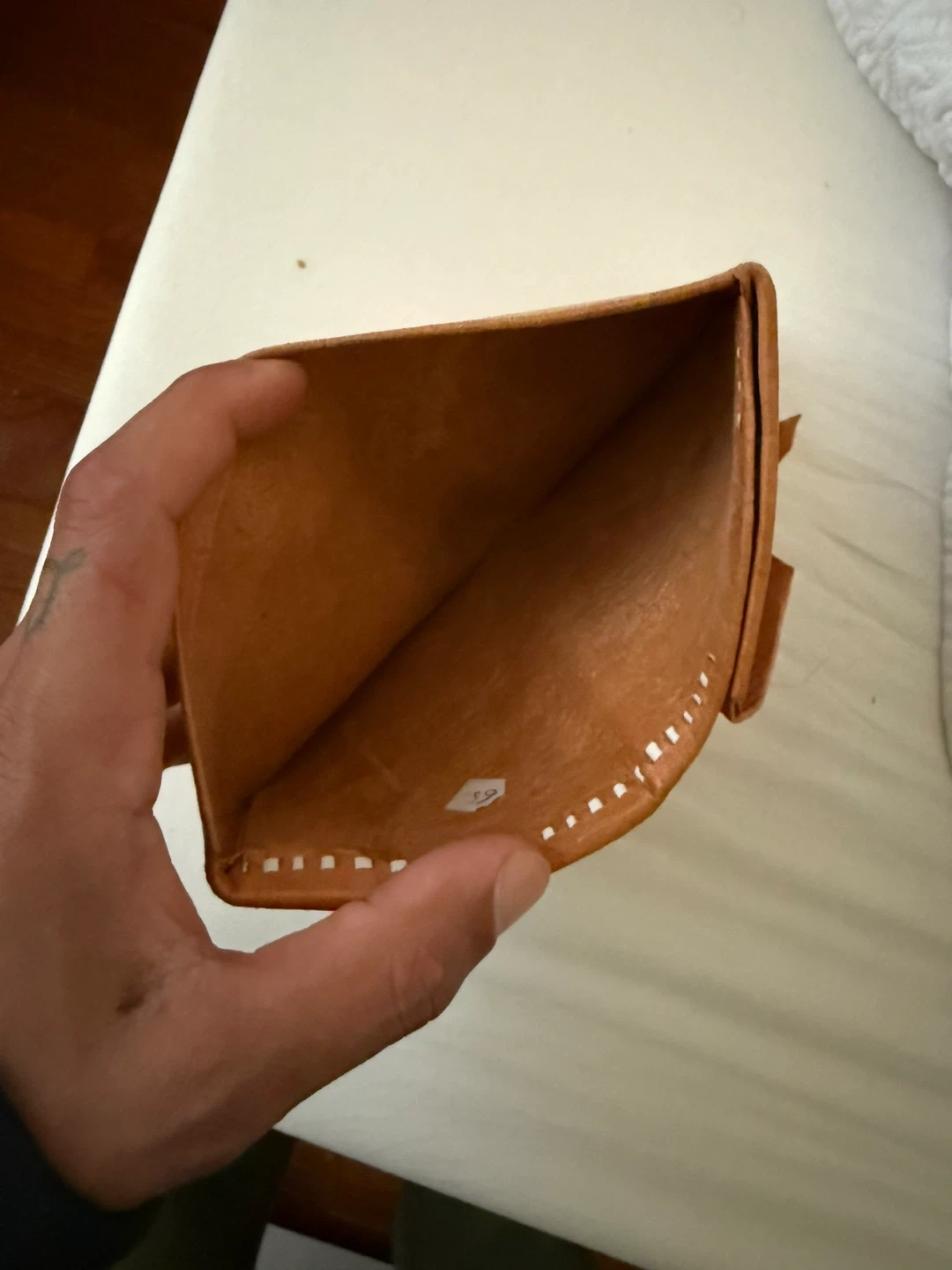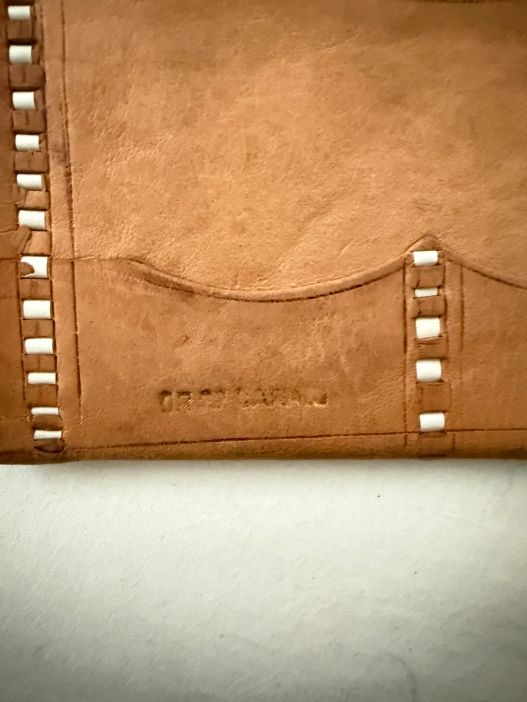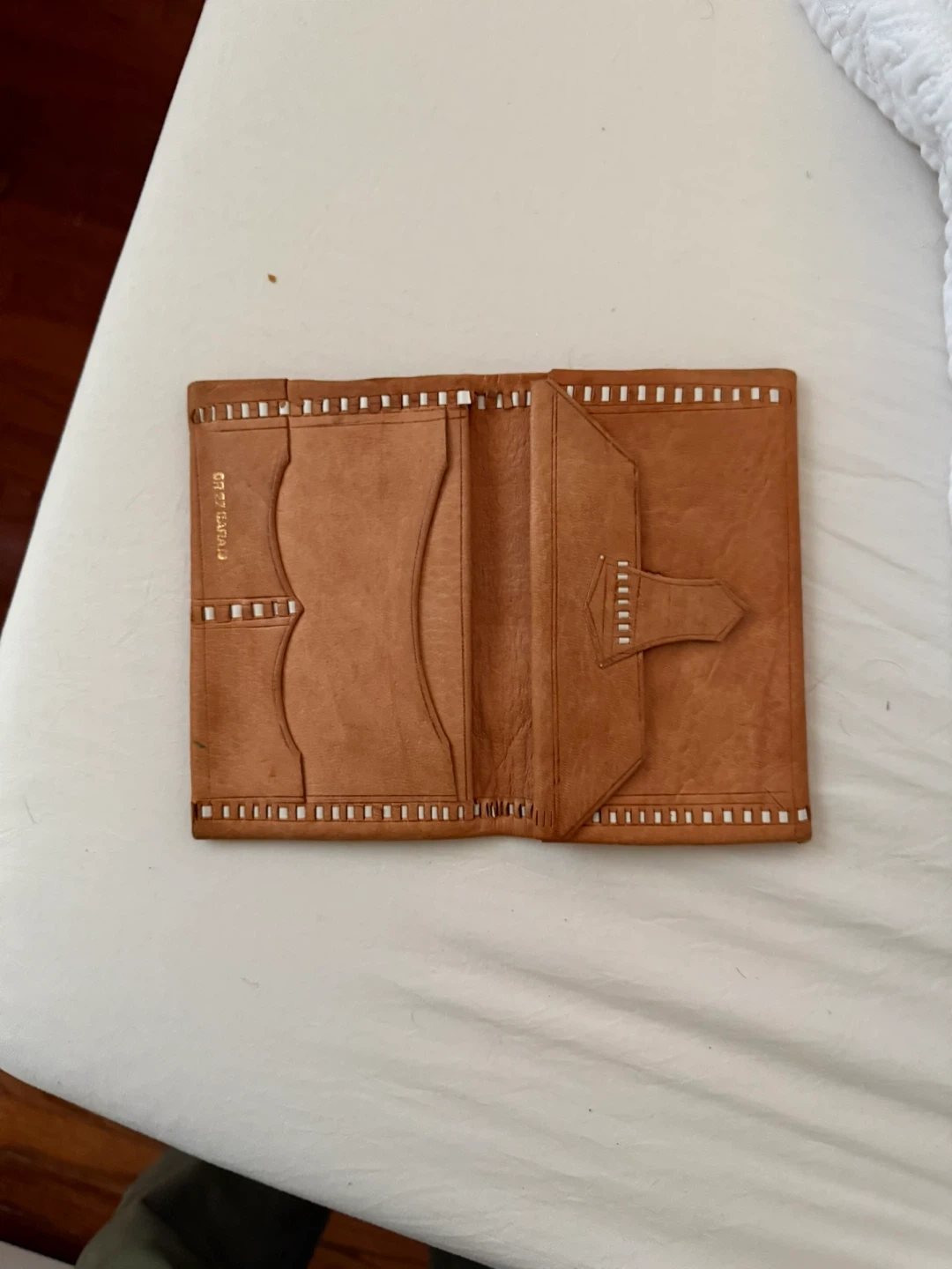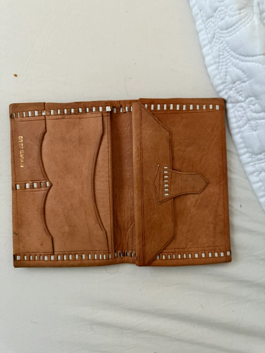 Selling a vintage leather wallet with a unique design. It has a tan color with gold accents. The wallet has some wear and tear, but it still has a lot of life left in it