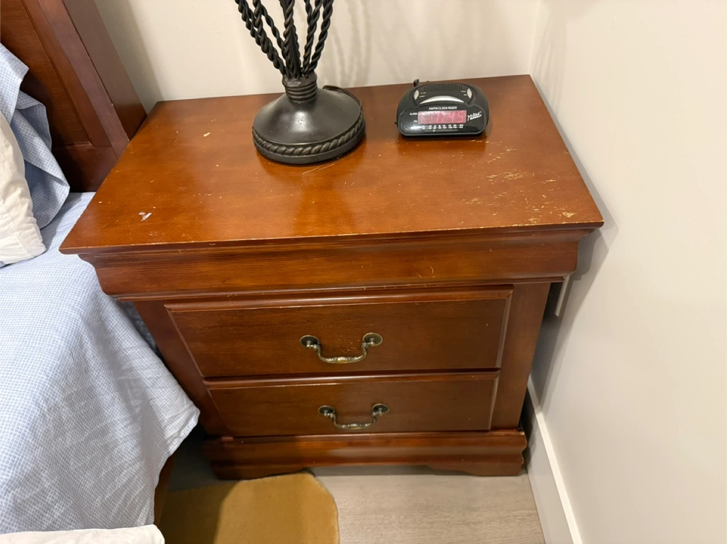 Bedroom set with a bed and a nightstand. The set shows signs of wear and use, as seen in the pictures.