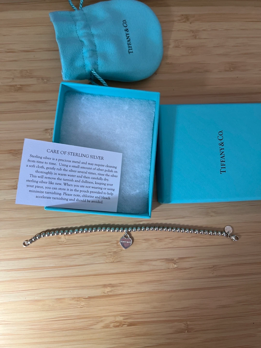 Selling a Tiffany & Co. sterling silver bead bracelet with a heart tag. It comes with the original box and pouch, perfect for gifting or treating yourself! The bracelet is in excellent condition and ready to wear. Needs some minor cleaning as I’ve never used it and kept it boxed all the time. The care instructions for sterling silver are also included. Originally cost $400+