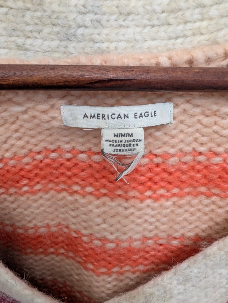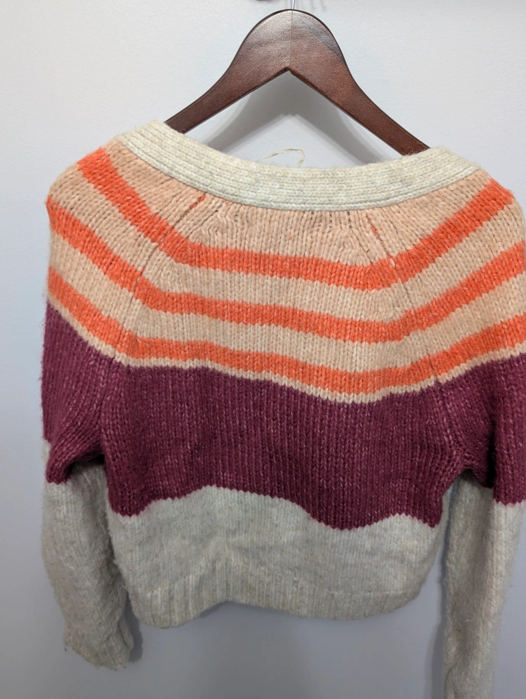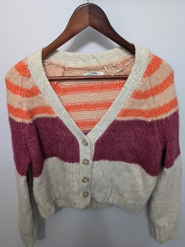 Cozy American Eagle cardigan in a size medium! It features a stylish striped pattern in shades of beige, orange, and burgundy. Perfect for layering and adding a pop of colour to your outfit