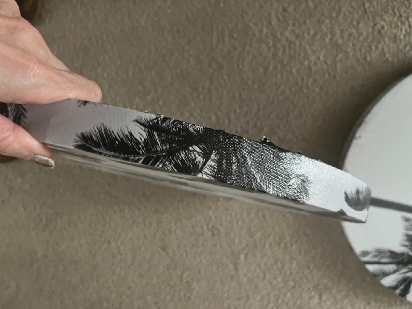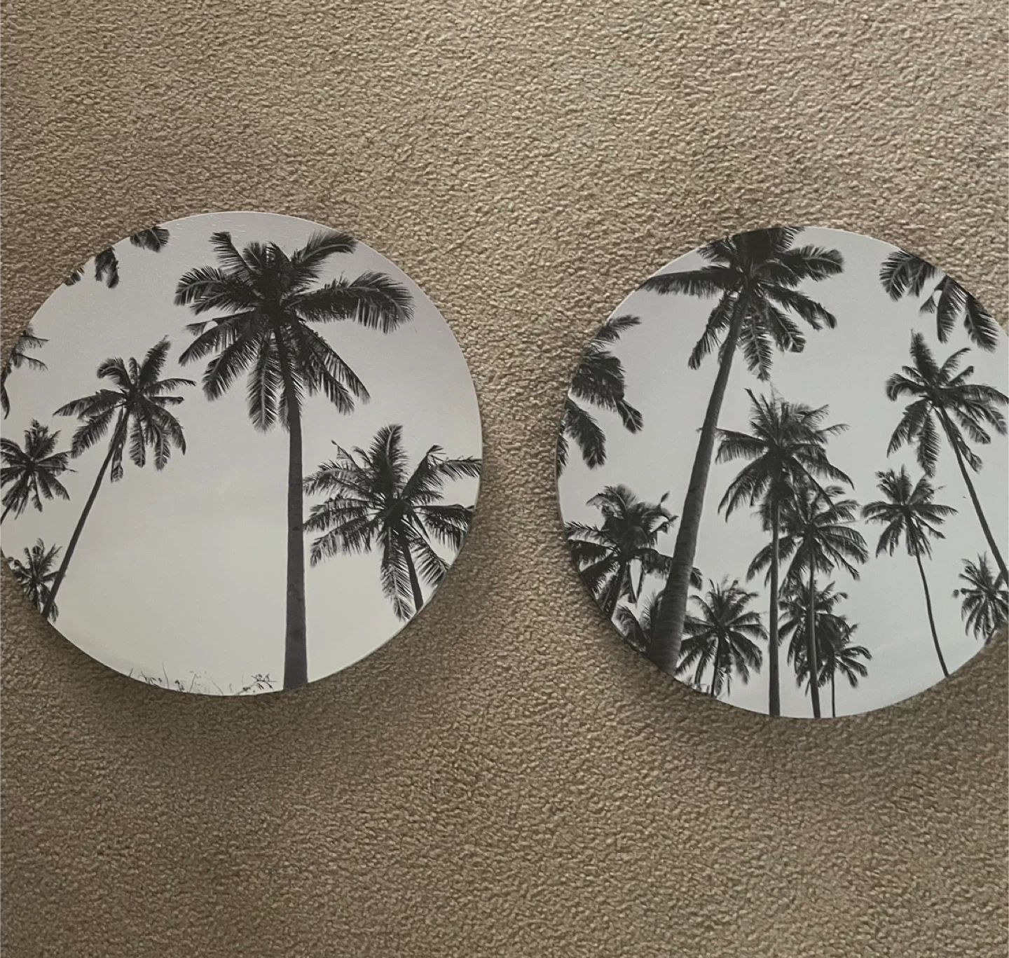 14β wide Selling a set of two round canvas wall art pieces featuring a black and white palm tree design. They're in great condition and would add a tropical vibe to any room!