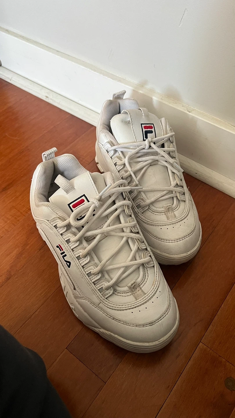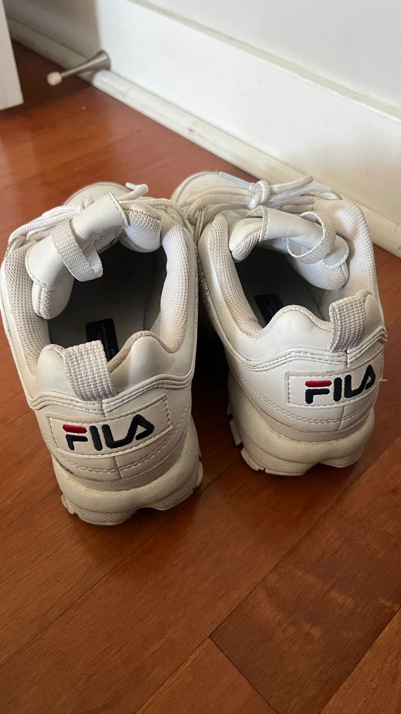 Selling a pair of Fila Disruptor sneakers in women's size US 6. They are white with the Fila logo on the side, back, and tongue. They've been gently used and are still in good condition.