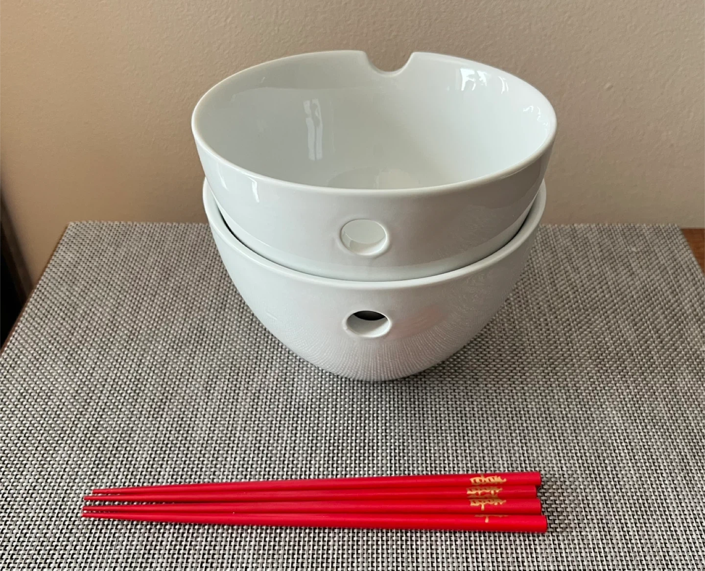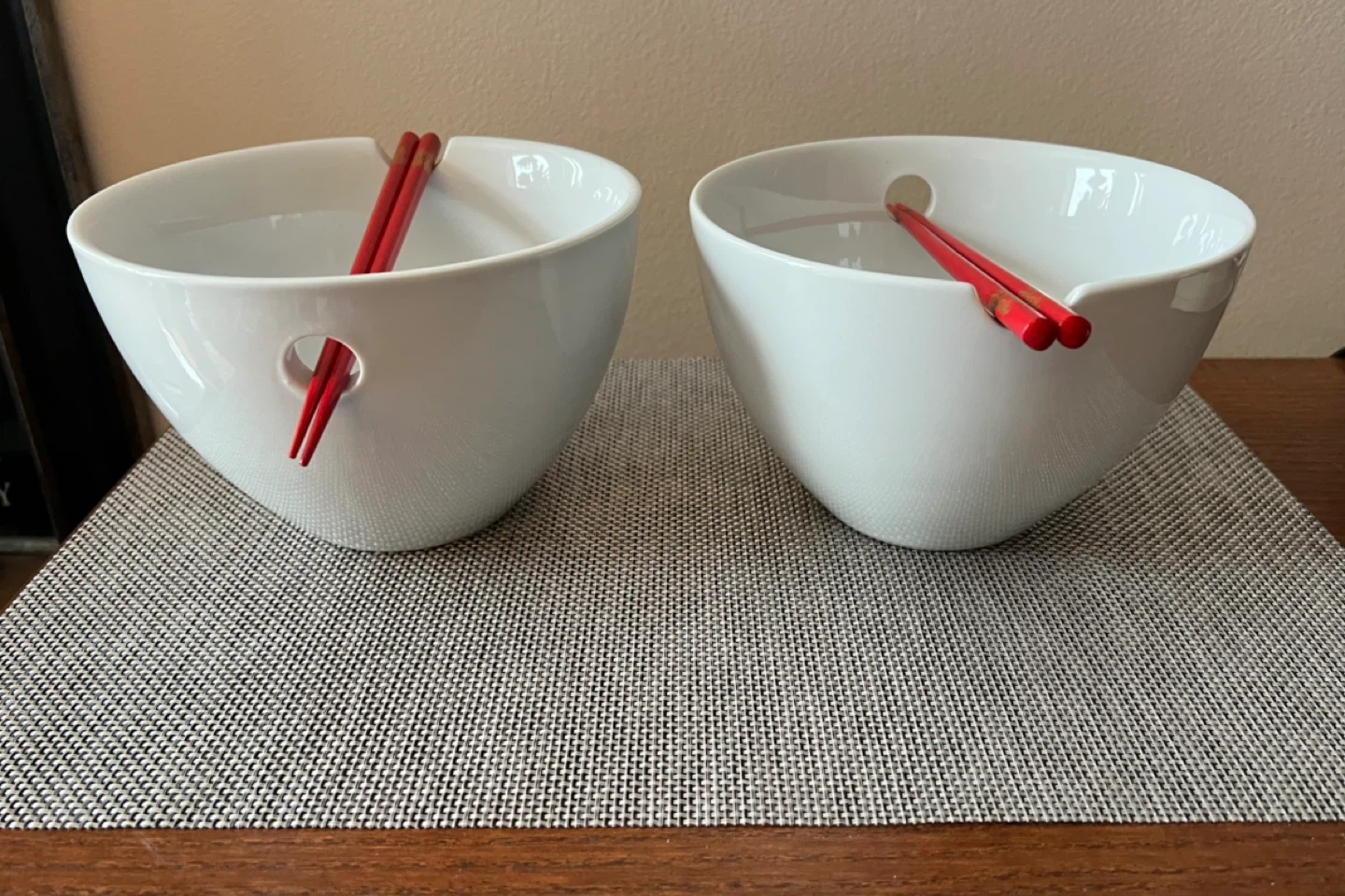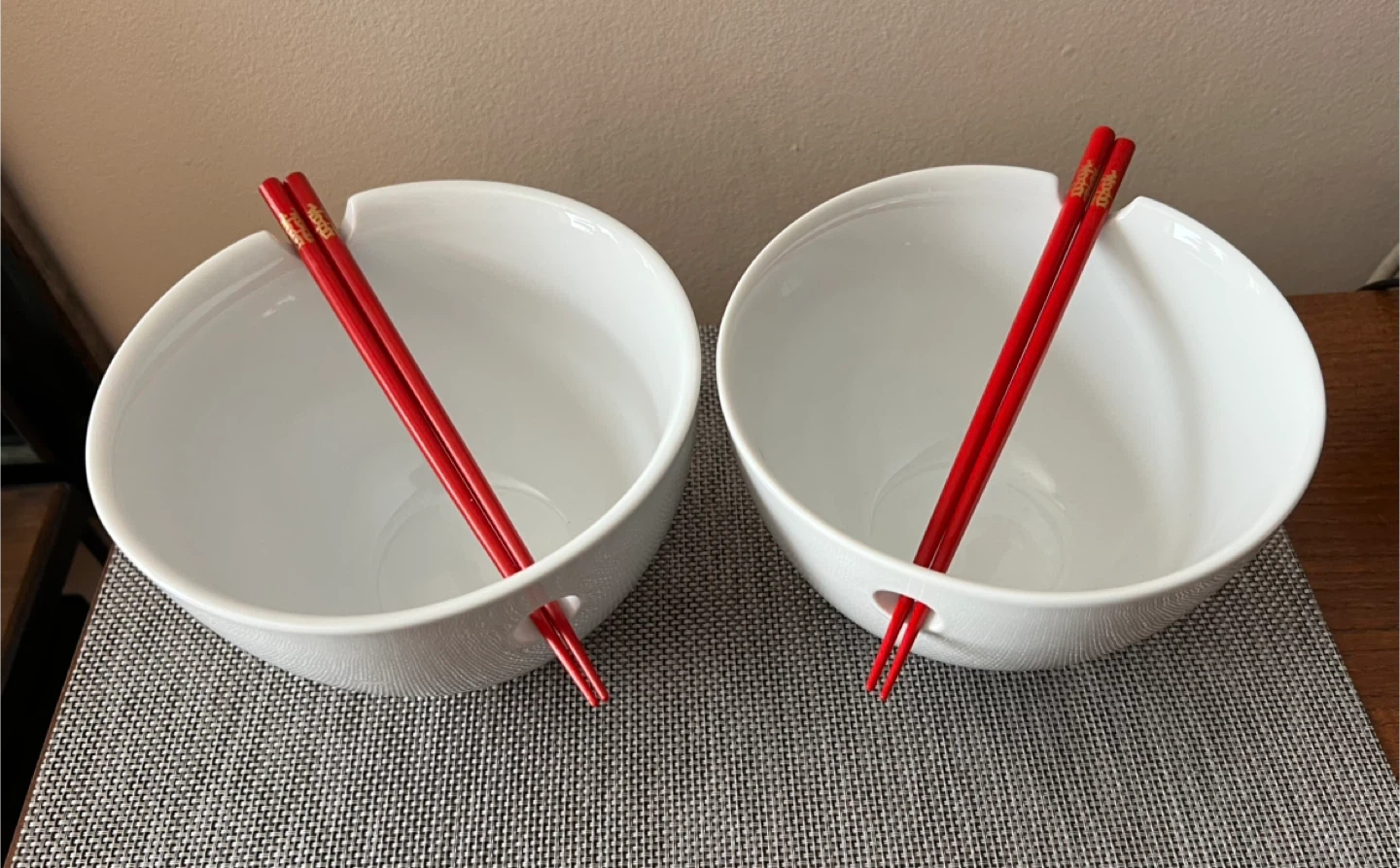 In like-new condition. Was a housewarming gift, but don’t use enough to keep. White porcelain bowls are perfect for ramen, pasta, Asian-style dishes. Bowls are designed with a round hole on one side and an indent on the other side to rest your chopsticks. Dimensions: 4.5” H and 7” Diameter Bowls are dishwasher and microwave safe; chopsticks should be hand washed. Pick up only near Astoria Park, Queens NYC 11102 Only Cash (preferred) or Venmo for payment Check out my other listings!