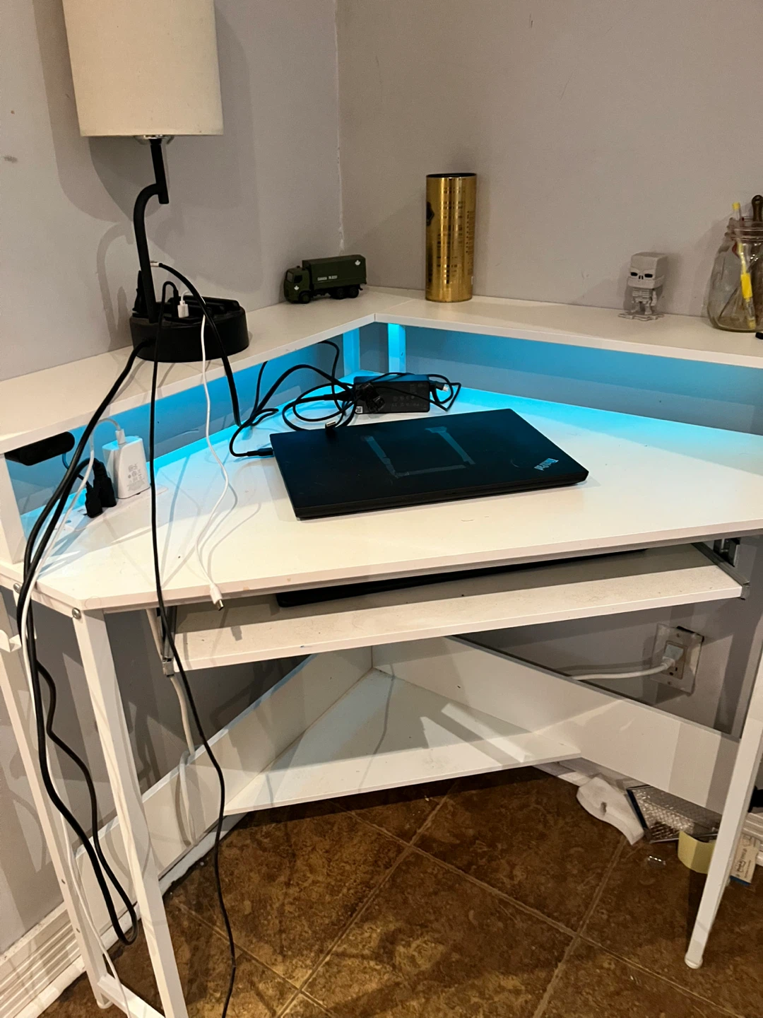 Selling a white corner desk, perfect for a small space! It features built-in blue LED lighting that adds a cool ambiance to any room. It's in great shape and ready for a new home