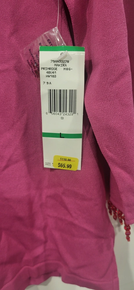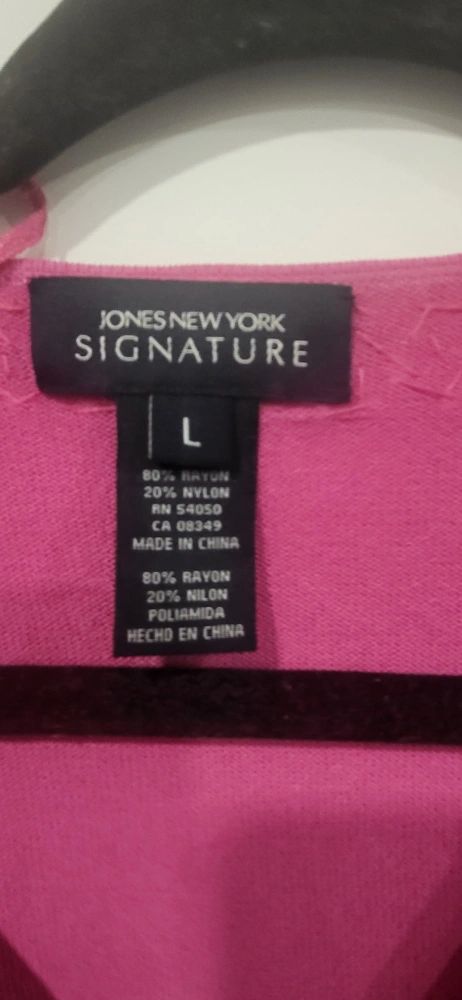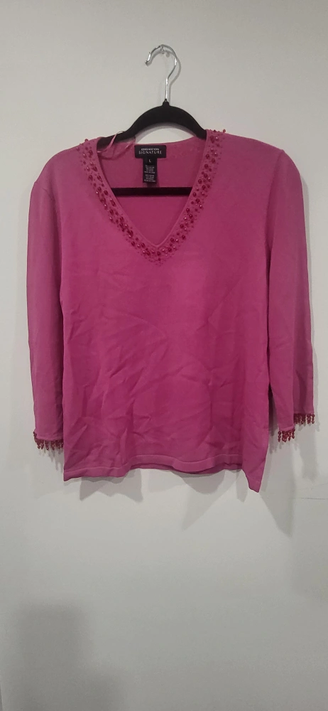 A Jones New York Signature,pink lightweight sweater. It has mid-length sleeves. There are bead decor on the neckline and sleeve ends. It is brand new with tags still on.
