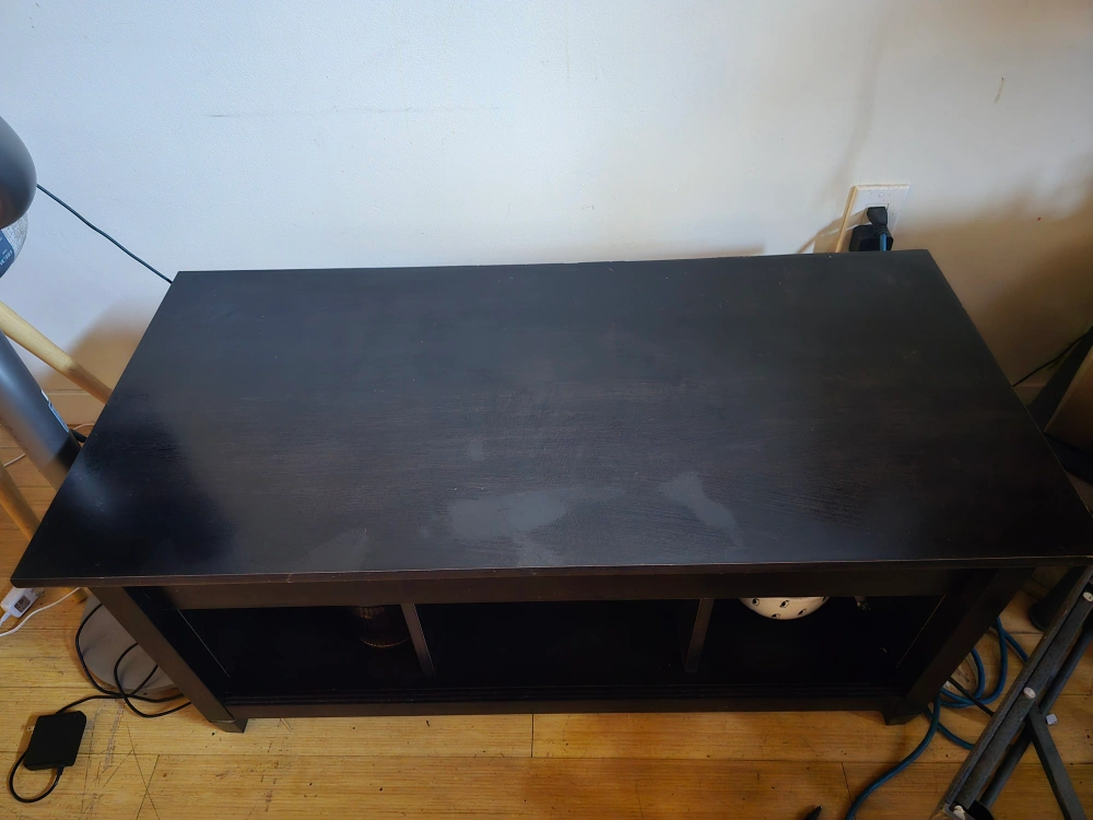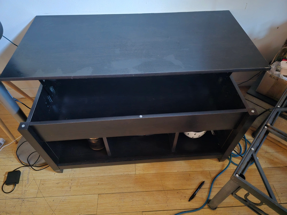 Selling a black TV stand coffee table. It has a shelf underneath for storage. The top lifts up and can be used as a tv table. It's in very good condition and ready for a new home