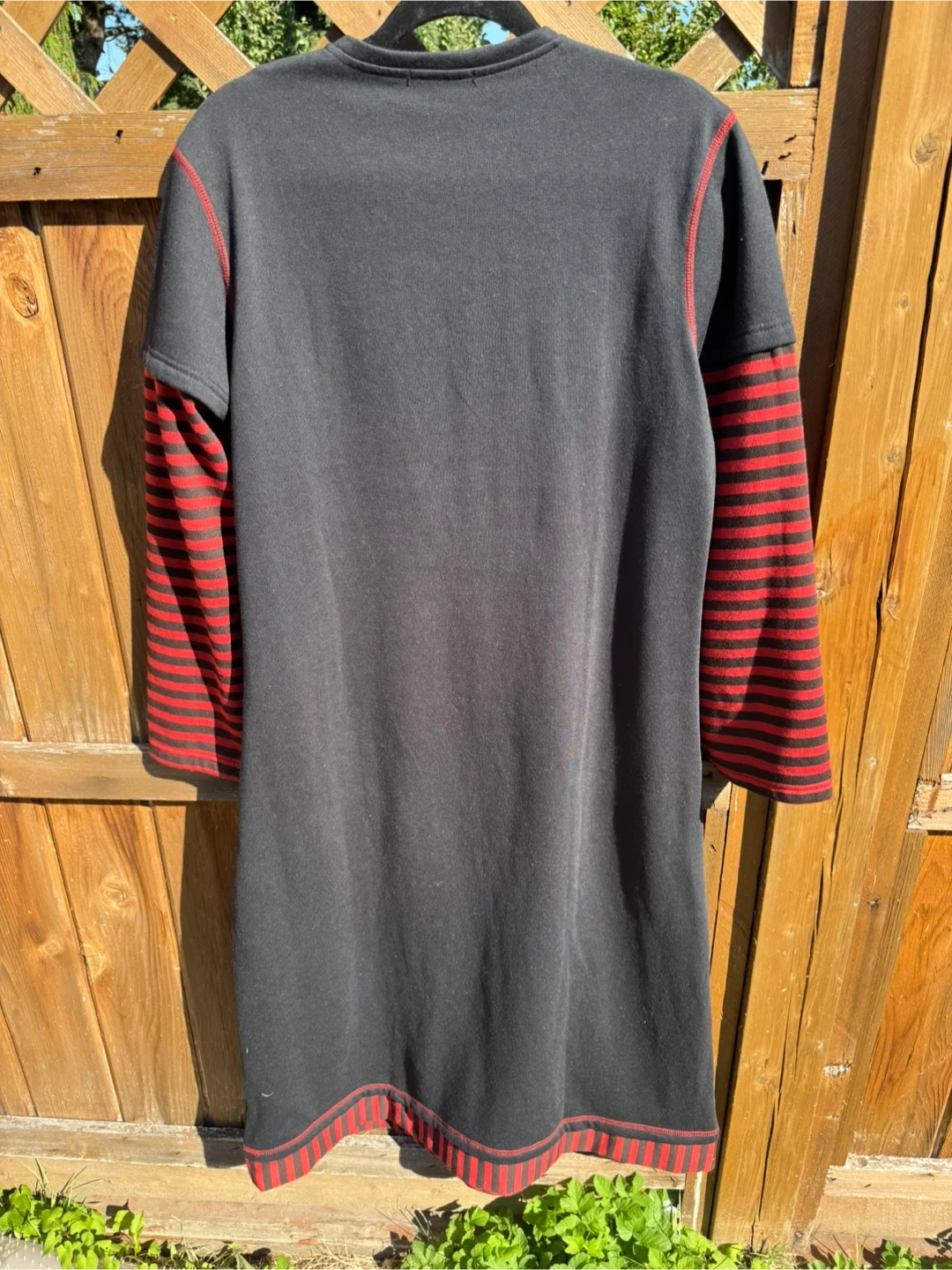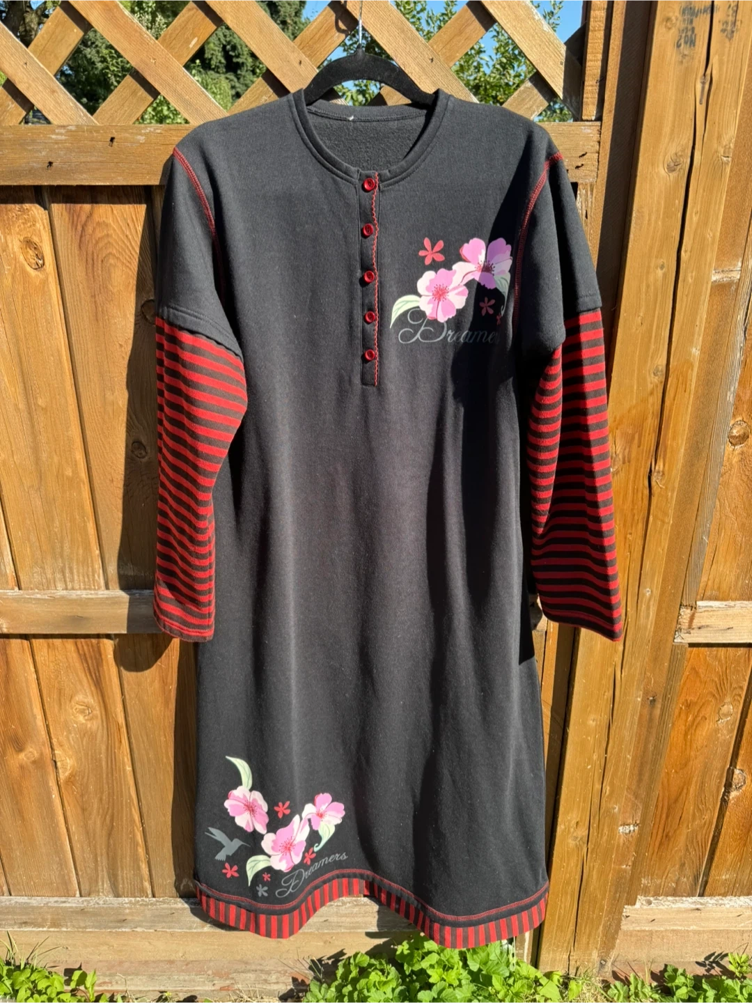 Cute Dreamers dress with a black body and red striped sleeves! It has floral accents and button details. Perfect for casual wear or lounging around at home