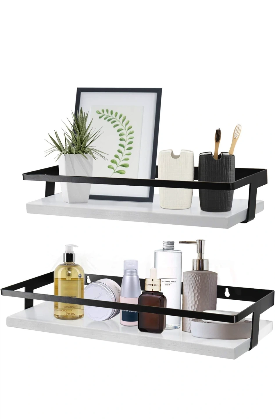 73Selling a new set of floating shelves! Perfect for adding a touch of modern style to your bathroom or kitchen. They're black metal with white shelves. The dimensions are 14.4 x 4.3 x 2.4 inches and 16.3 x 5.1 x 2.4 inches. They come in the original box