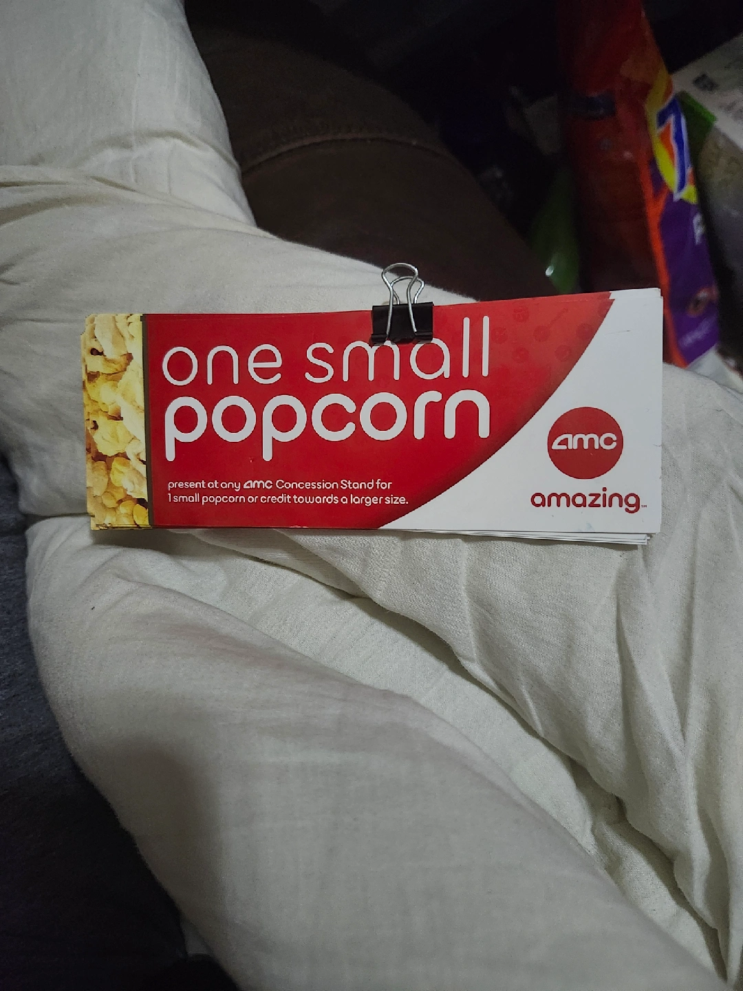 Selling 30 vouchers for one small popcorn at any AMC Concession Stand! It can also be used as credit towards a larger size. I can sell separately for $3 each.