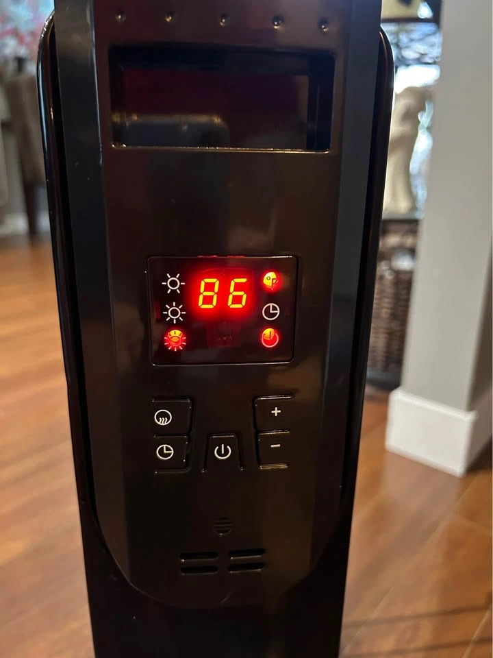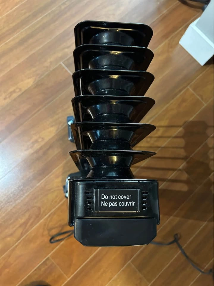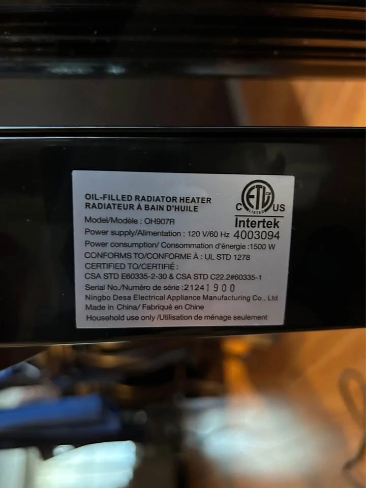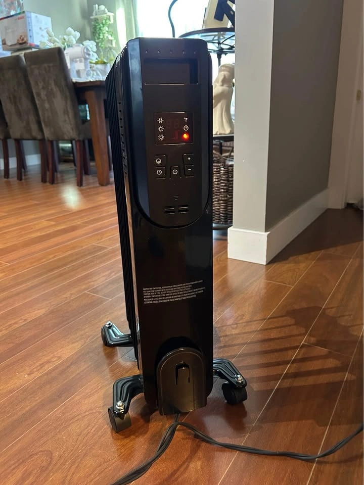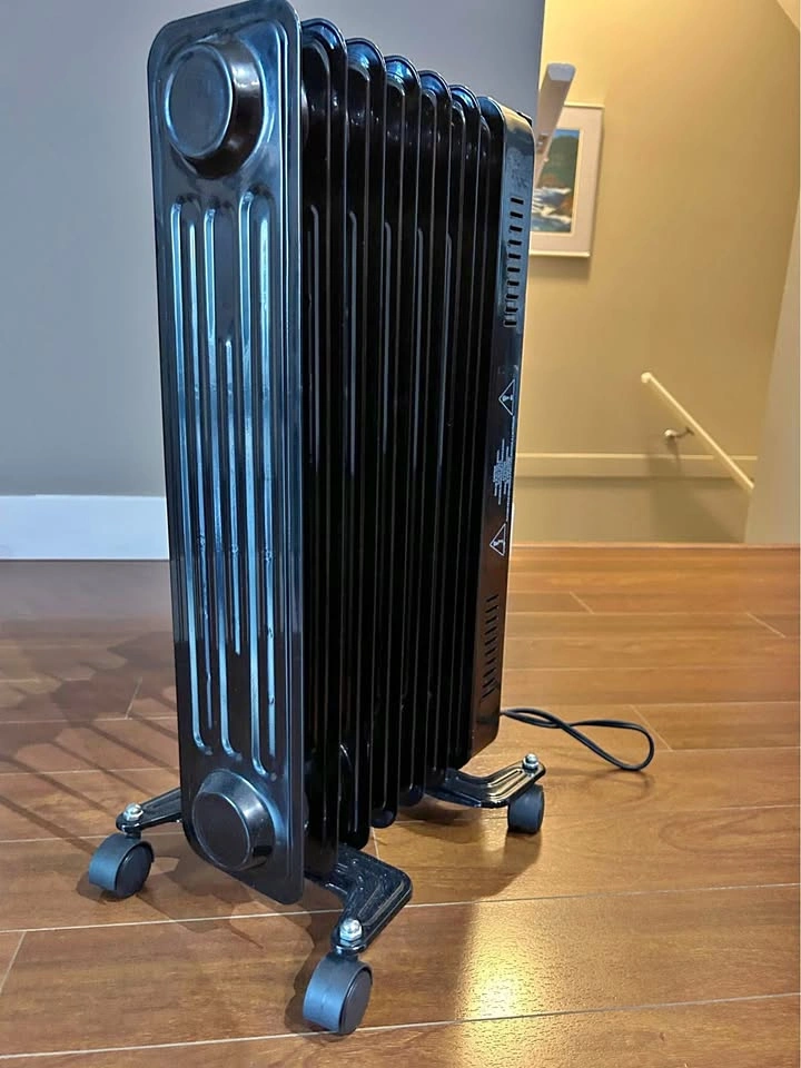 Cash only pickup at 96 ave and 204 st Langley Intertek 1,500W oil-filled heater with a thermostat, perfect for indoor use in medium-sized rooms. With a heating element format of oil and a BTU heating rating of 1000 Btu/h, this black heater can cover an area of up to 300 sq ft. It features adjustable thermostat settings, wheels for easy mobility, and automatic shut off for added safety. The sleek design, including a handle and a floor-standing mounting location, makes it a convenient and efficient heating solution for any home.