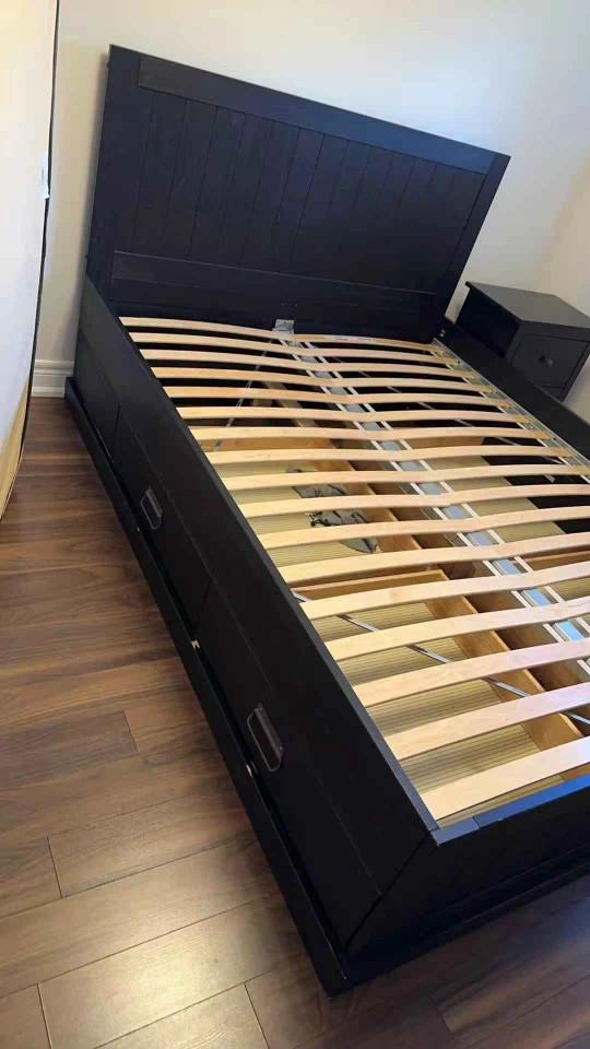 Selling a queen bed frame in black with built-in storage. It's in great shape and has drawers underneath for extra space. Perfect for keeping your bedroom tidy!