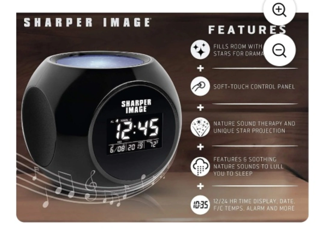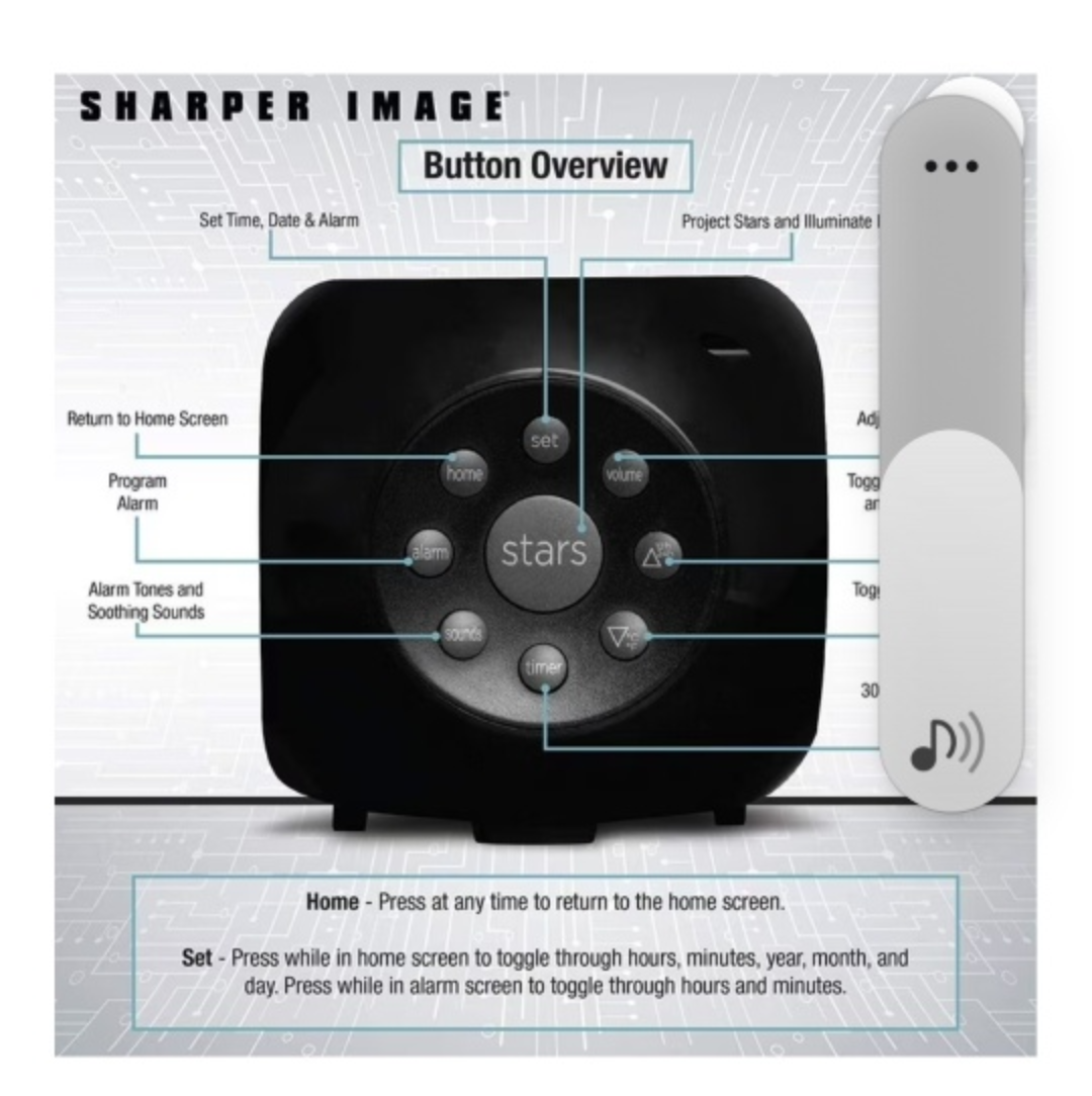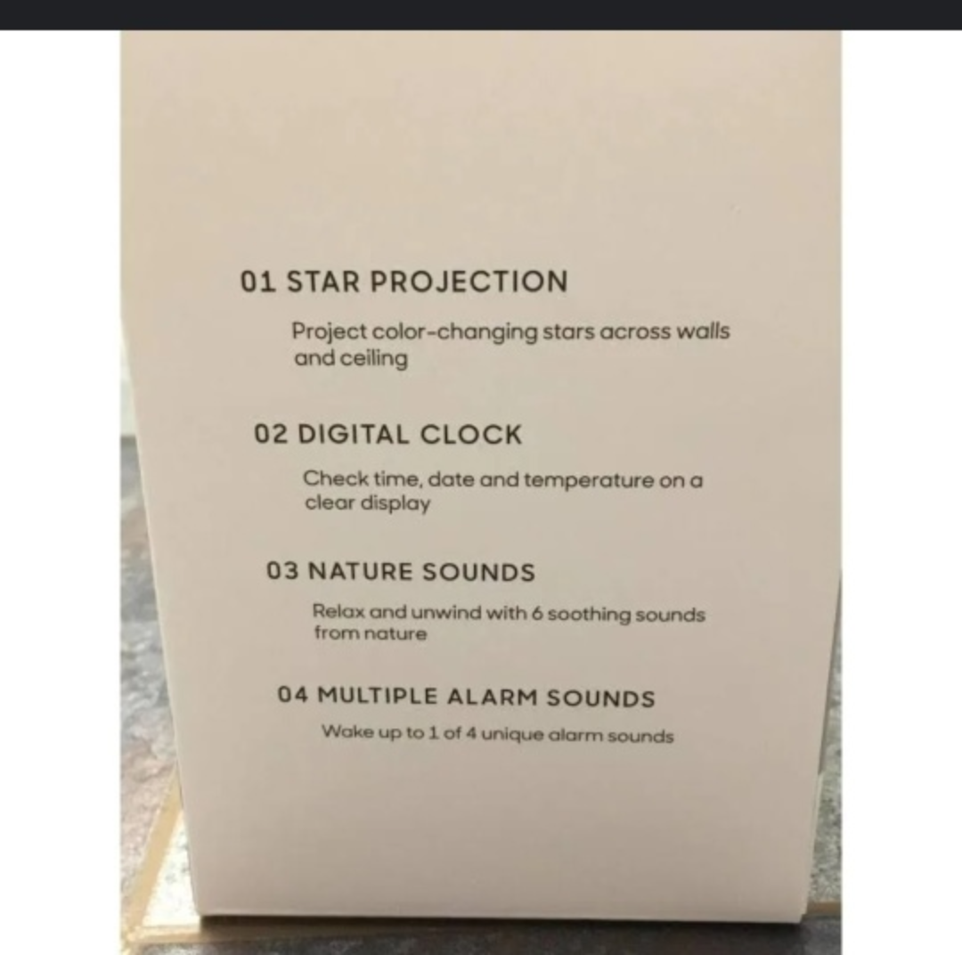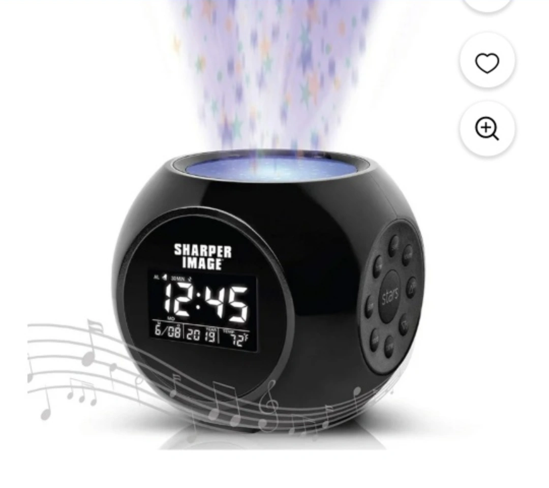 I'm selling a Sharper Image star projector alarm clock! It features a soft-touch control panel, nature sound therapy, unique star projection, and soothing nature sounds . It has a 12/24 HR time display, date, F/C temps, and alarm! This item is used but tested and installed with new batteries.