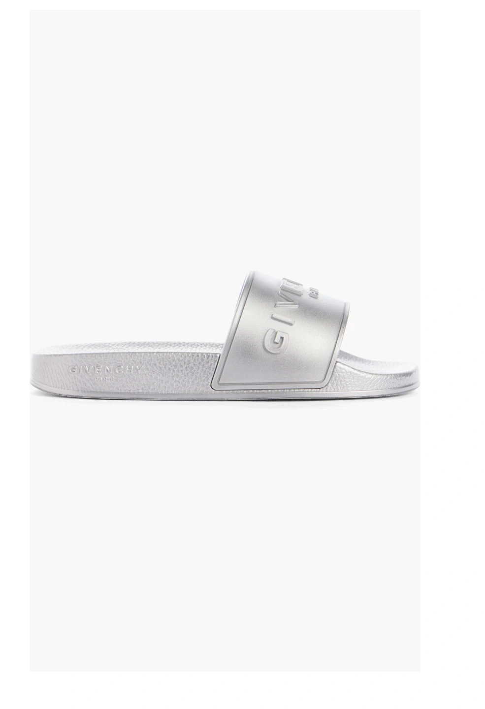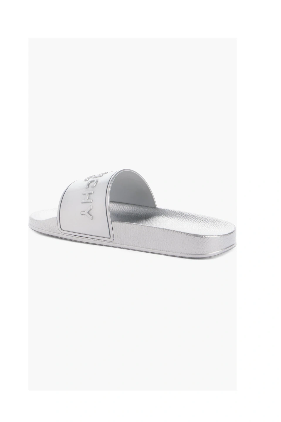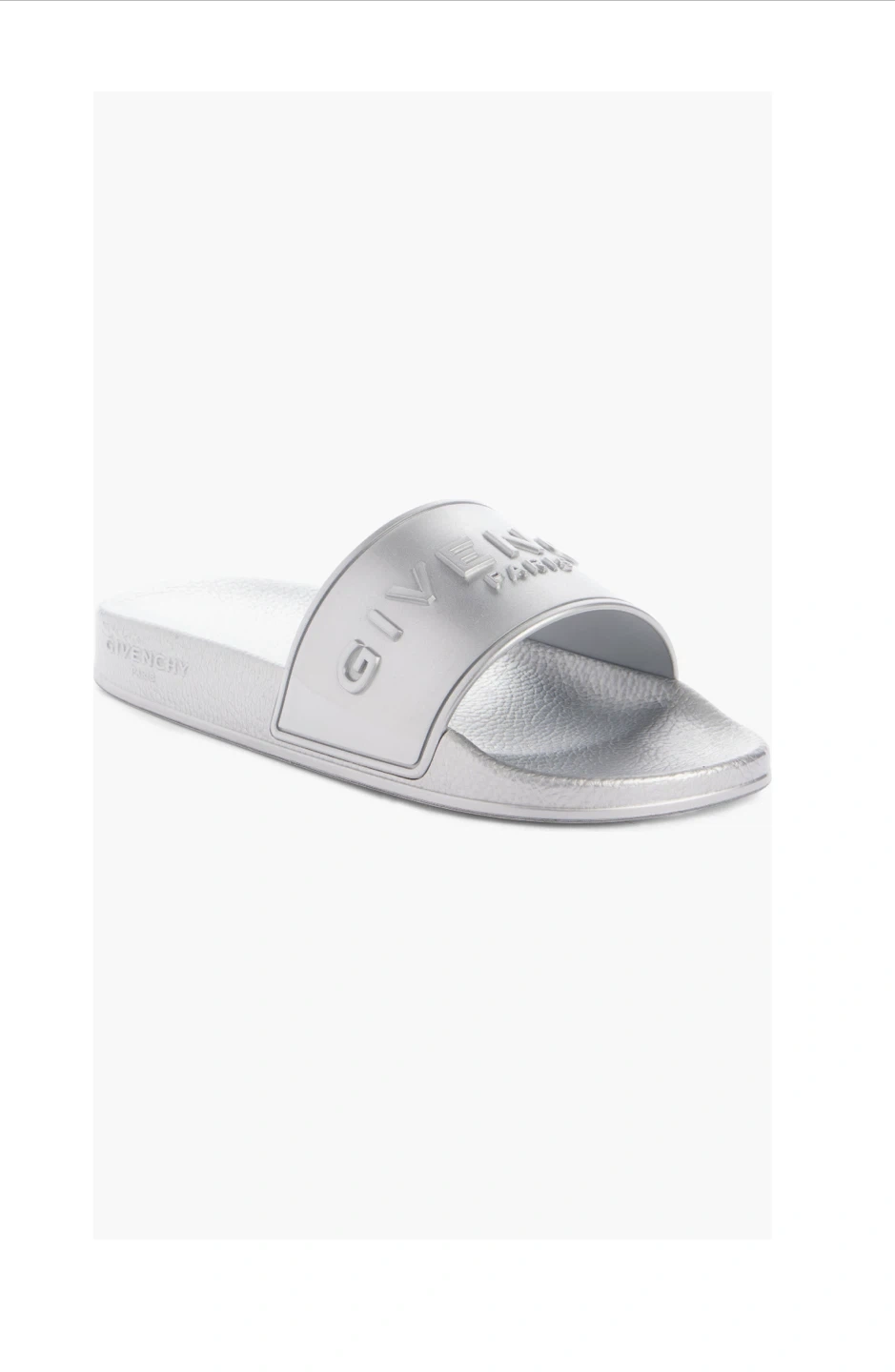 65These are a pair of Givenchy slides in silver. The brand's name is embossed on the strap. Brand New