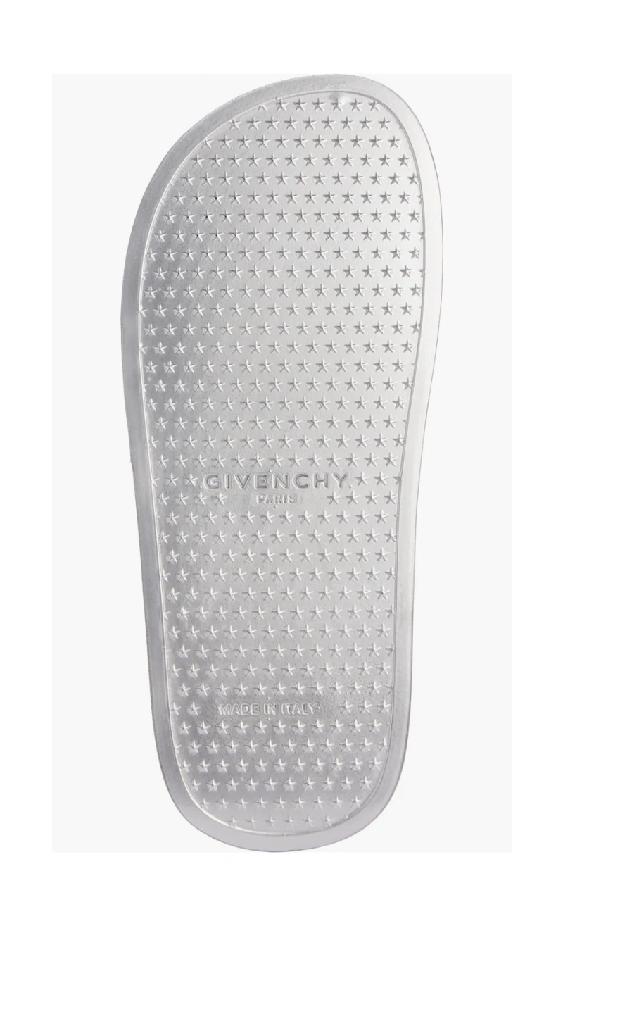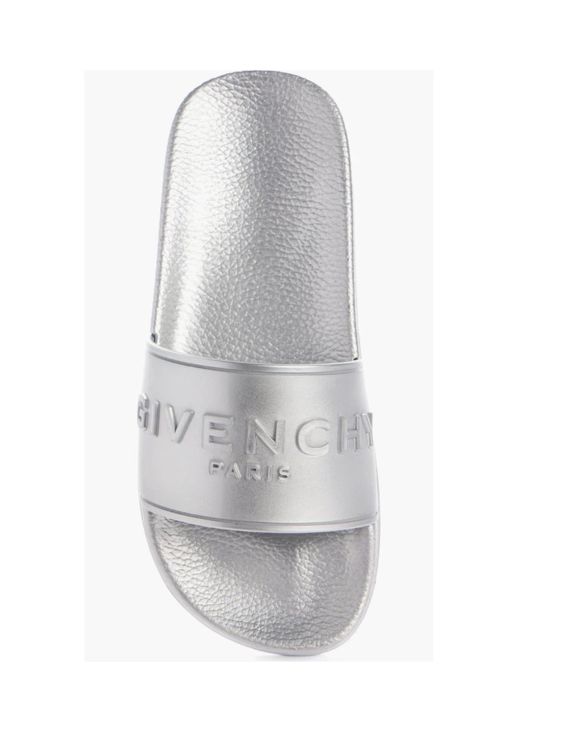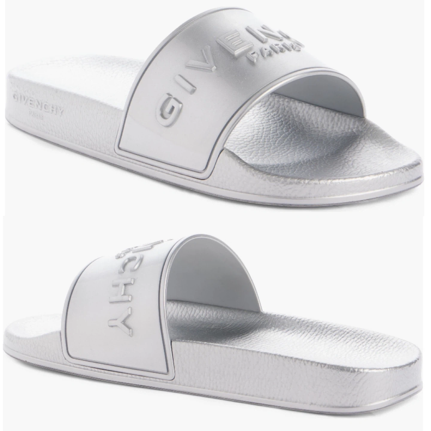 65These are a pair of Givenchy slides in silver. The brand's name is embossed on the strap. Brand New