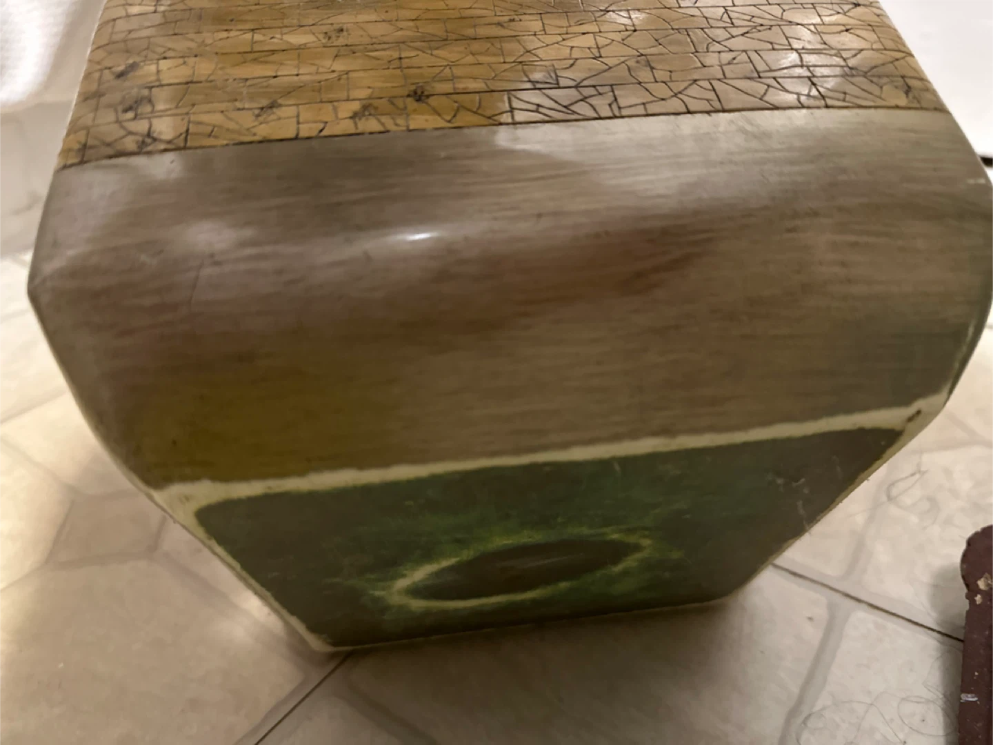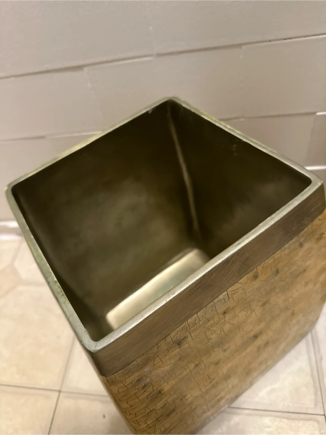Here's a unique decorative planter! It's made of ceramic and has a cool, textured pattern on the outside. Perfect for adding a touch of rustic charm to your home or garden