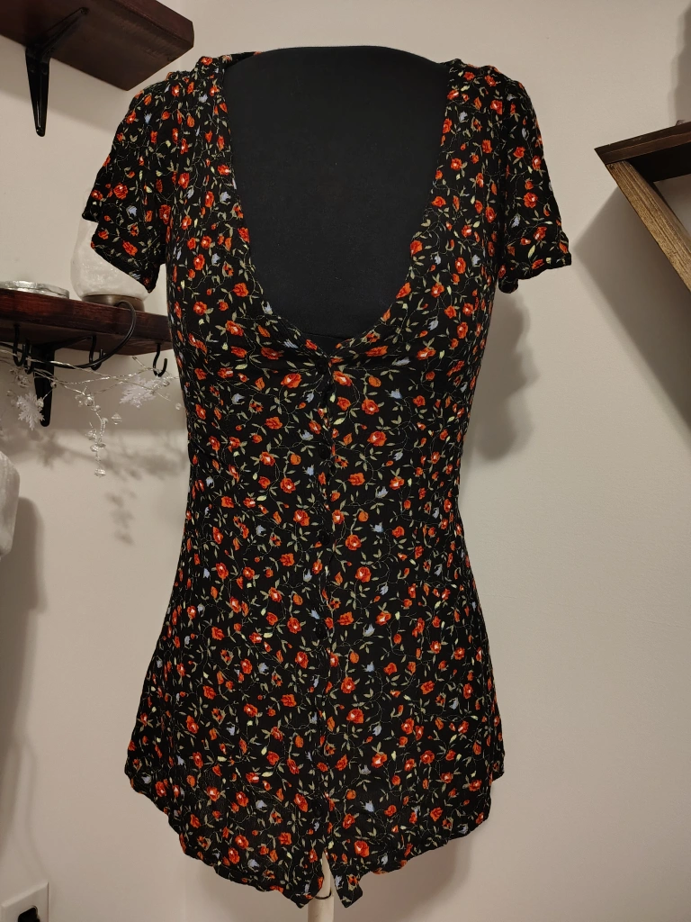 Cute floral minidress in a size XXS. It features a lovely floral pattern on a black background. Perfect for a casual day out. It has short sleeves and a flattering fit. Missing one upper button but can be worn with layers underneath.
