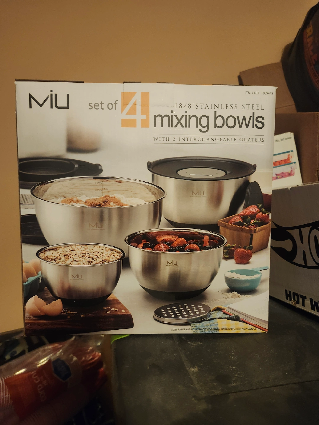 Selling a MIU set of 4 mixing bowls! They are made of 18/8 stainless steel and come with 3 interchangeable graters. Perfect for all your baking and cooking needs