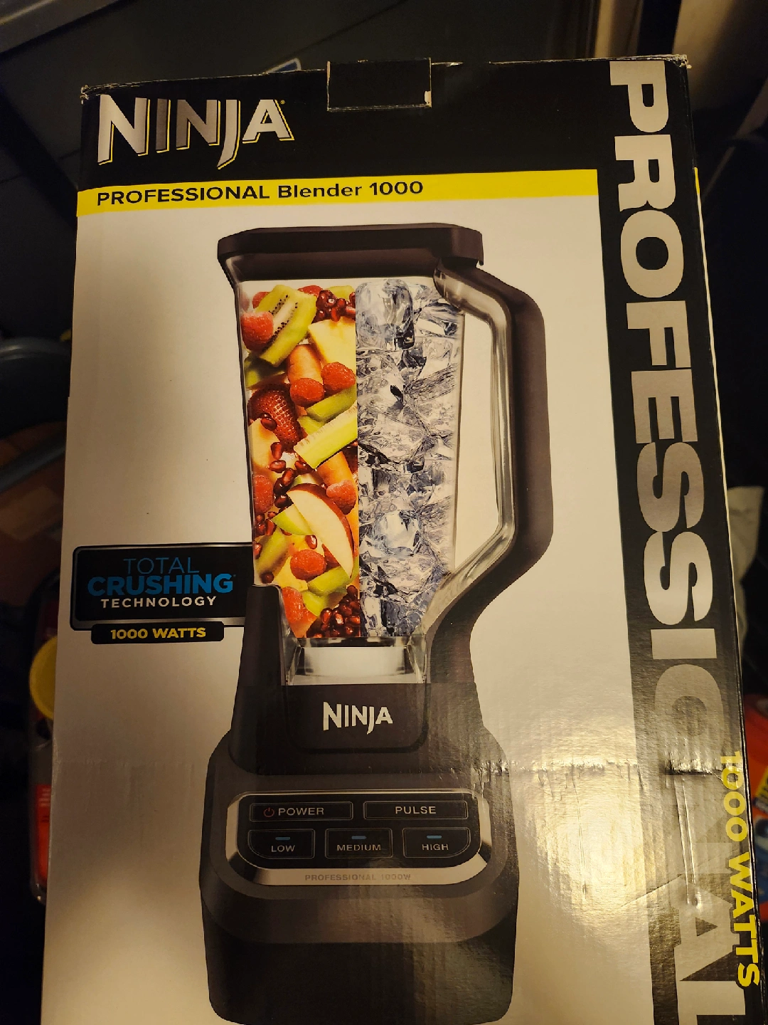 Selling a Ninja Professional Blender 1000. It features total crushing technology and 1000 watts of power. It has power, low, medium, and high settings, as well as a pulse function