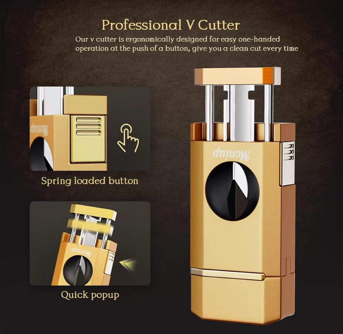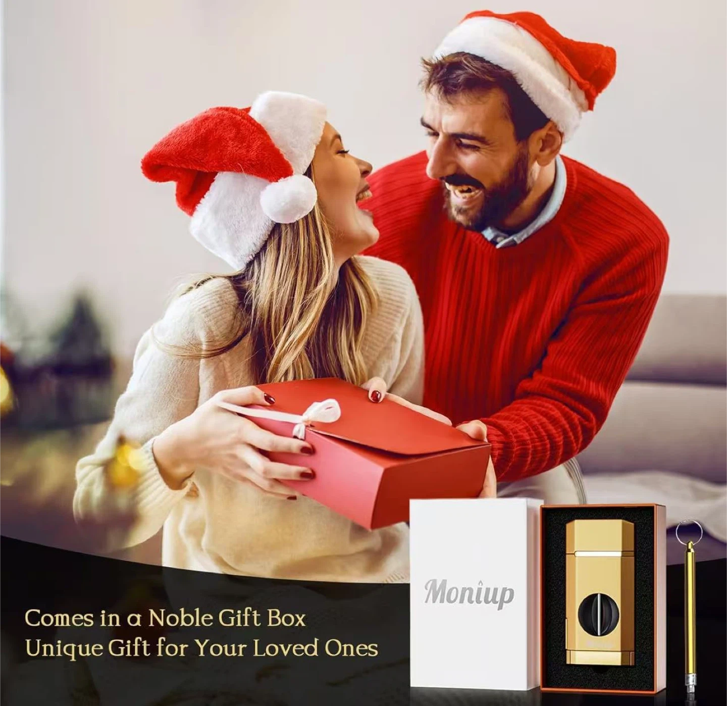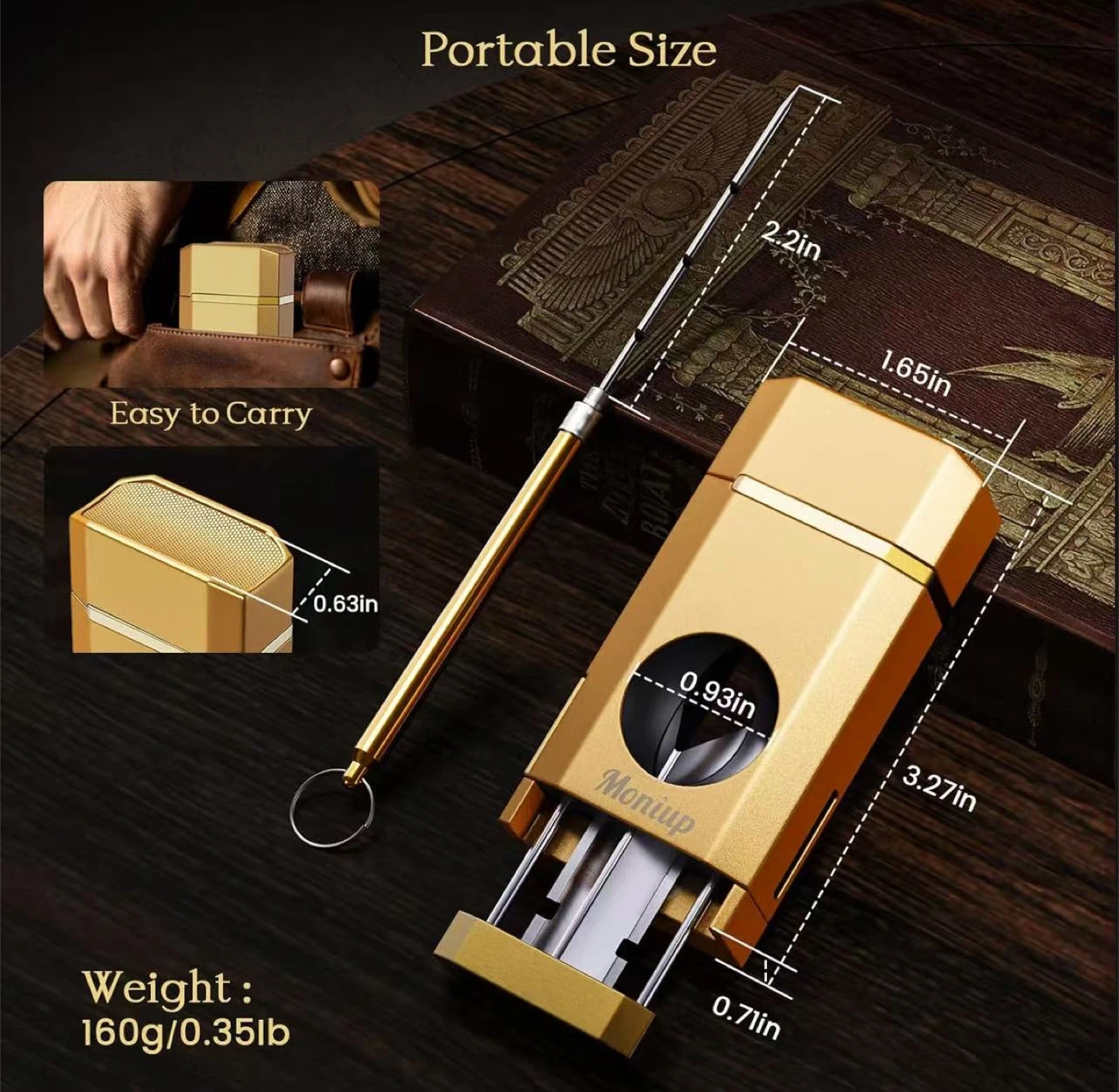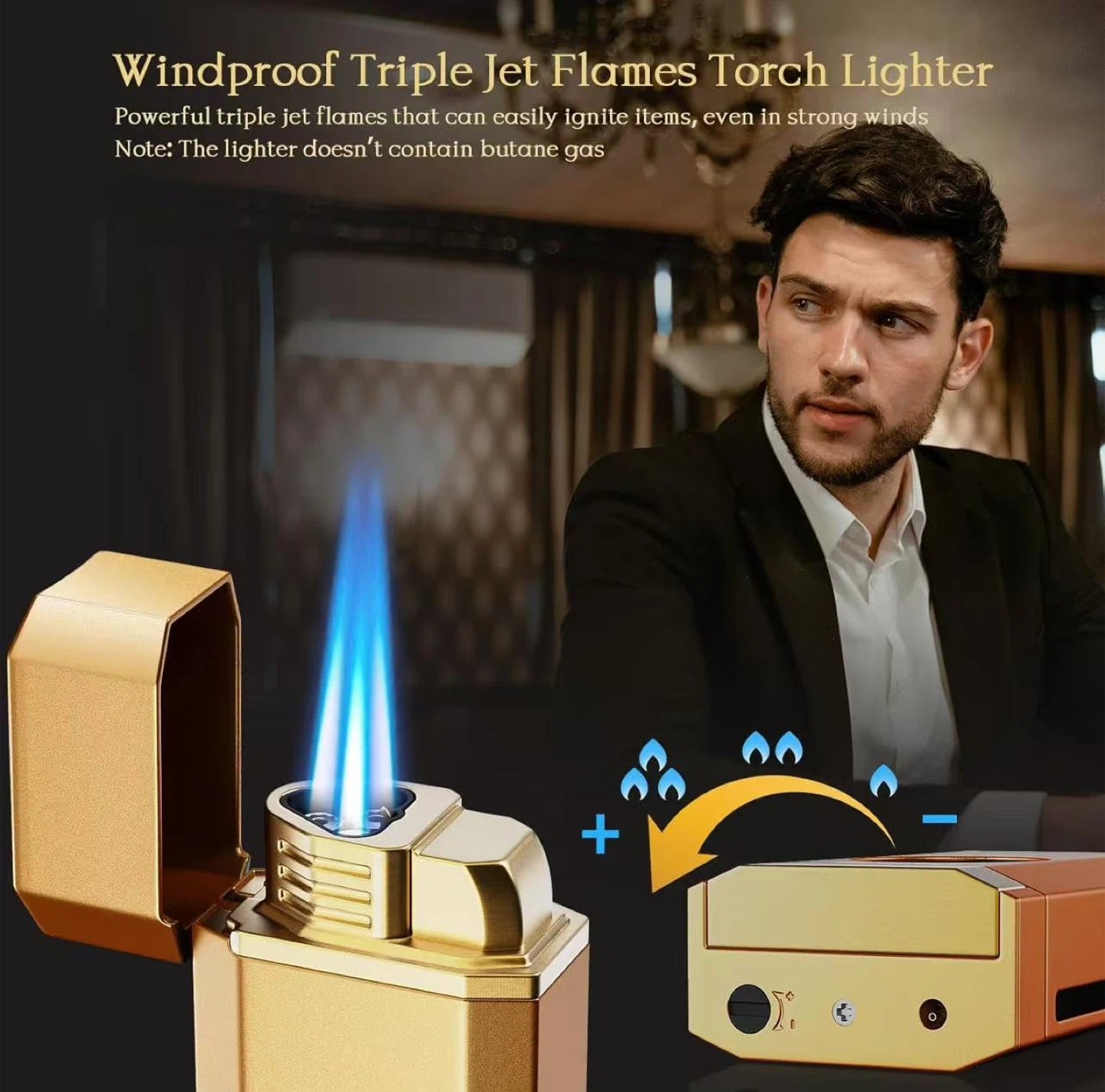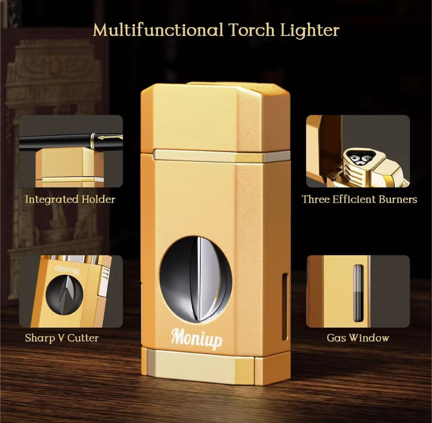 Triple Jet Torch Lighter with One-Touch V Cutter, Holder, Draw Enhancer Tool, Gifts for Men, Butane Refillable Lighter, Multifunctional All-in-one Lighter with Accessories, for Outdoor Travel, Candles