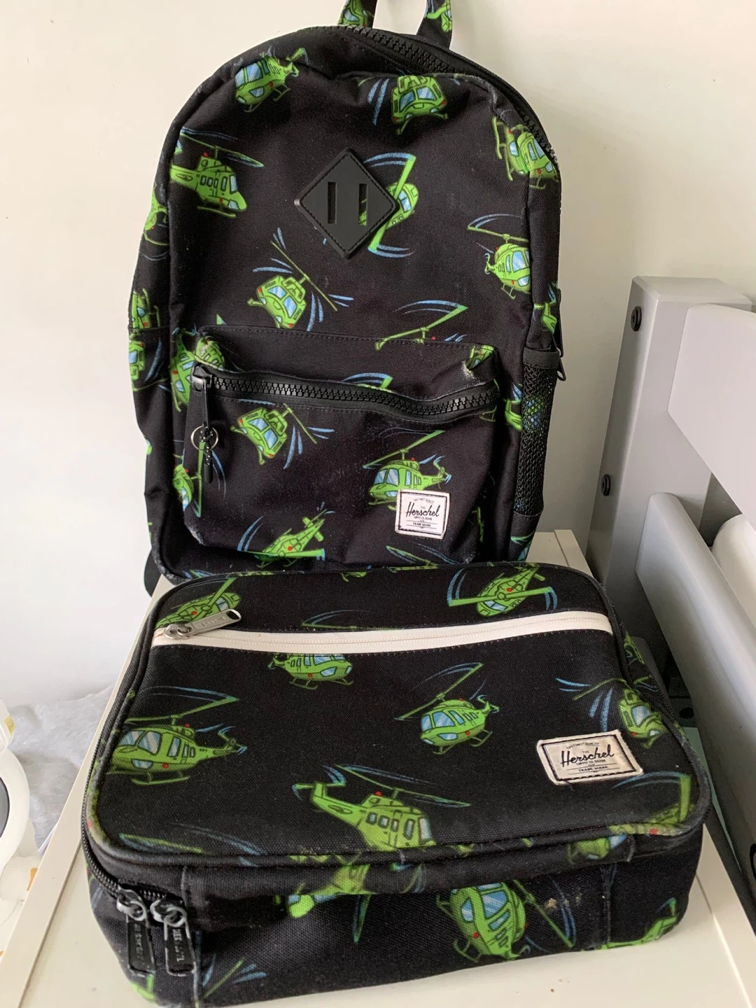 Here's a cute Herschel backpack and lunch bag set for kids! It features a fun helicopter print on a black background. The backpack has a red and white striped interior lining. Perfect for school or outings!