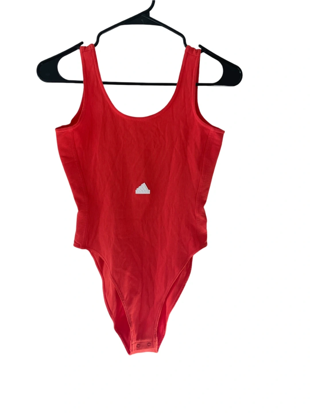 Check out this vibrant red Adidas bodysuit! It features a ribbed texture and the classic Adidas logo. Perfect for workouts or a stylish casual look. It's in like new condition and ready for a new home!