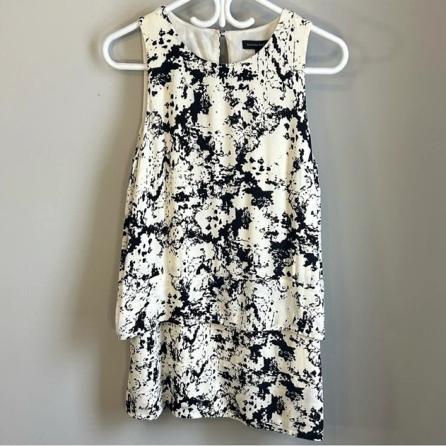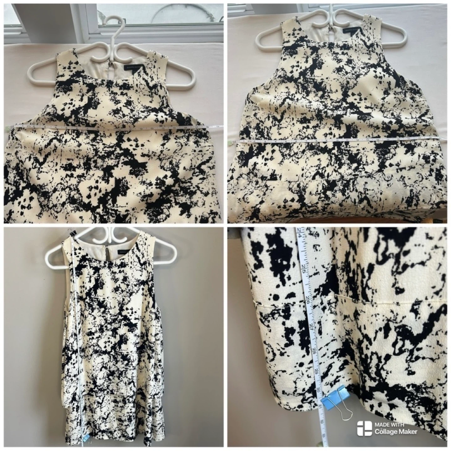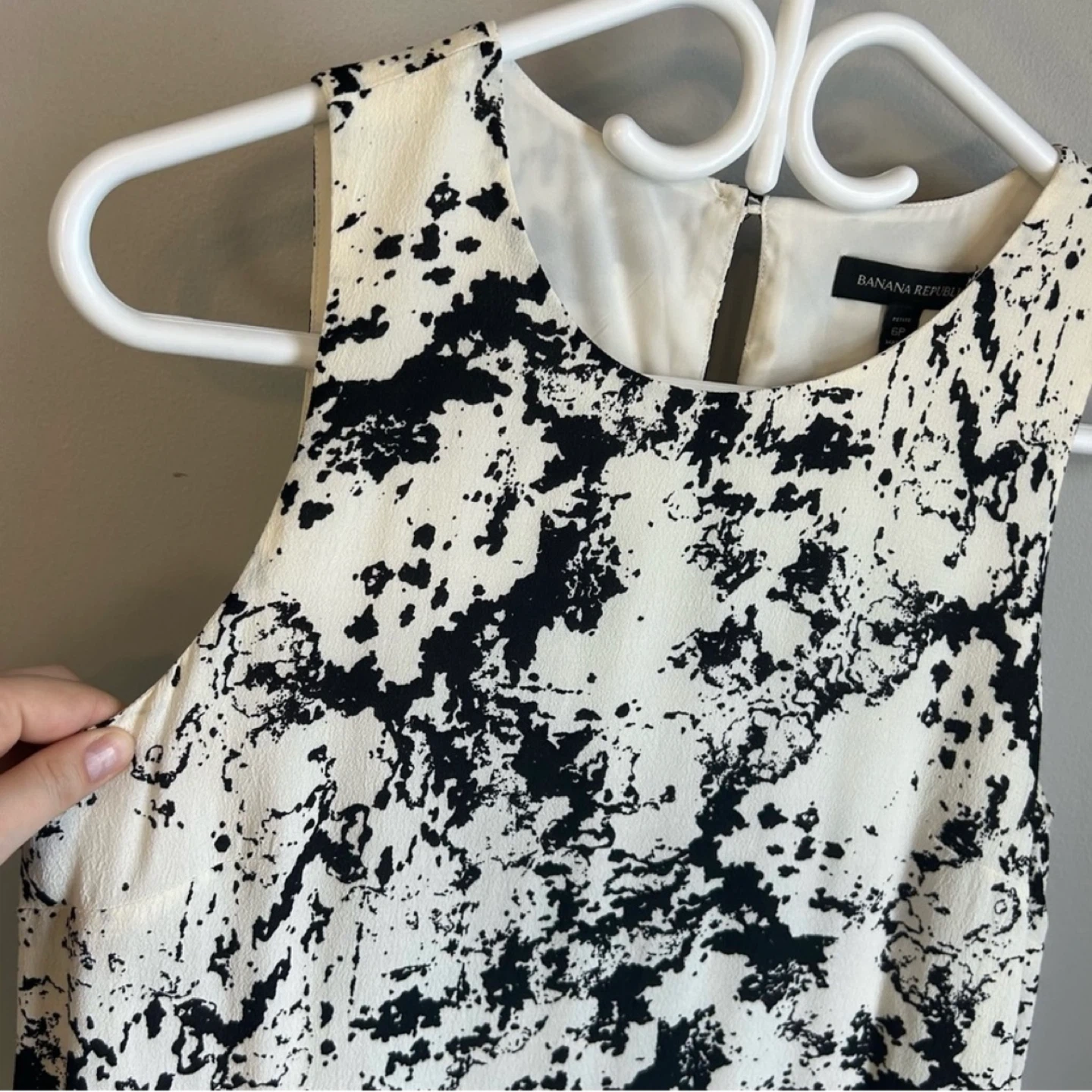 Black and white print layered shift dress from Banana Republic. Button closure at neck. Snaps at shoulders to keep bra straps in place. Hardly worn. Women ’s size 6 petite. See photos for measurements. Cross posted.