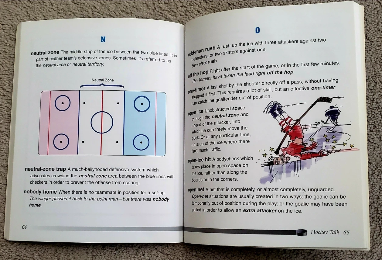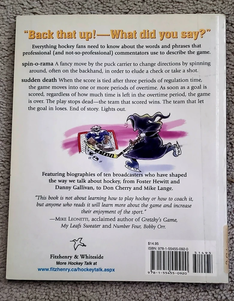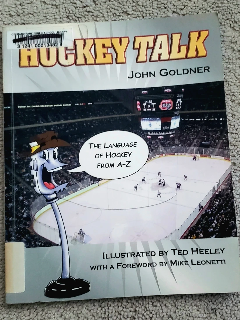 Hockey Talk by John Goldner explains the language of hockey from A-Z and is illustrated by Ted Heeley with a foreword by Mike Leonetti. This book teaches you the words and phrases that professional commentators use to describe the game.