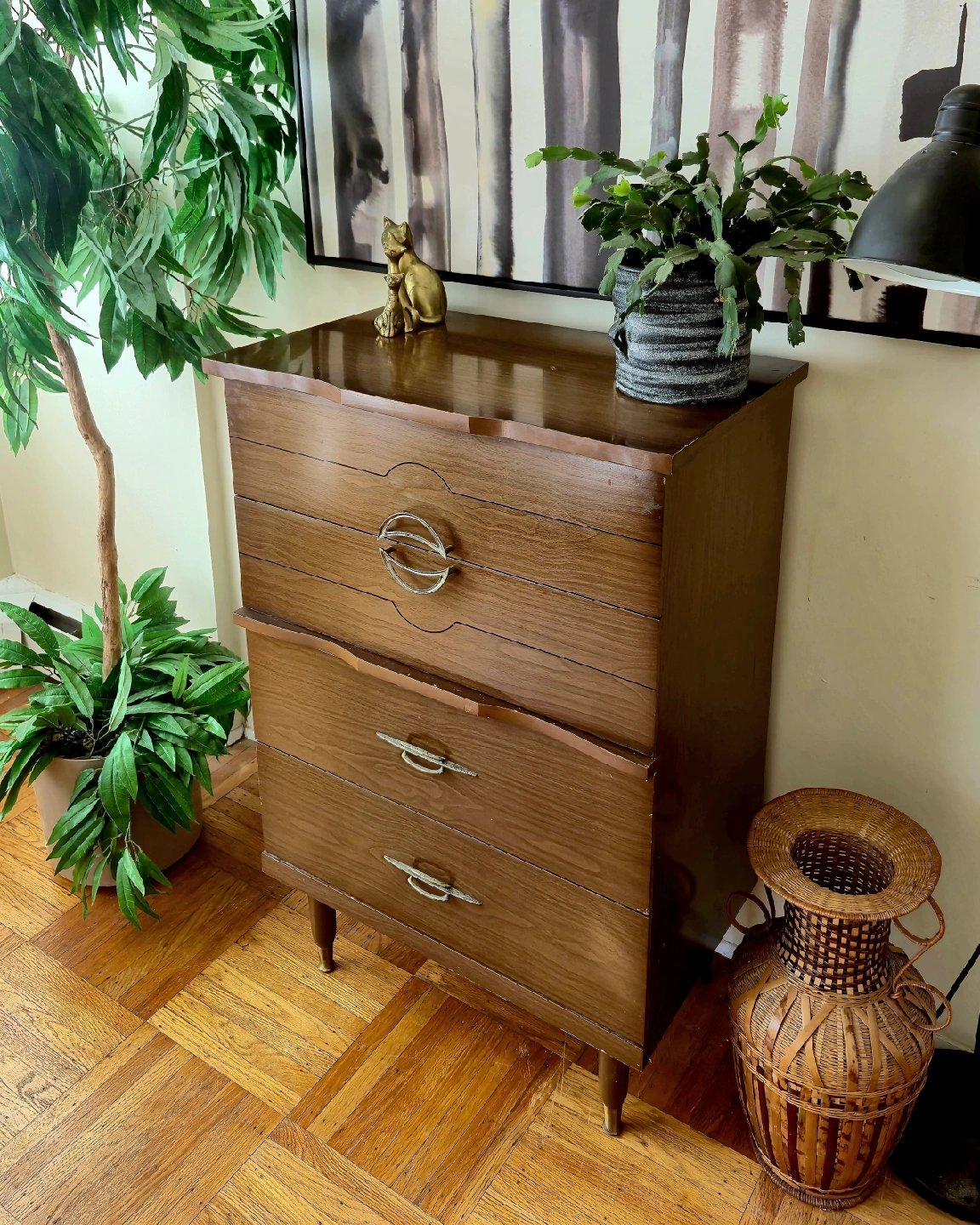 Selling a charming vintage wooden dresser with four drawers. It's a unique piece with a lovely wood grain finish. Perfect for adding a touch of retro style to any room!