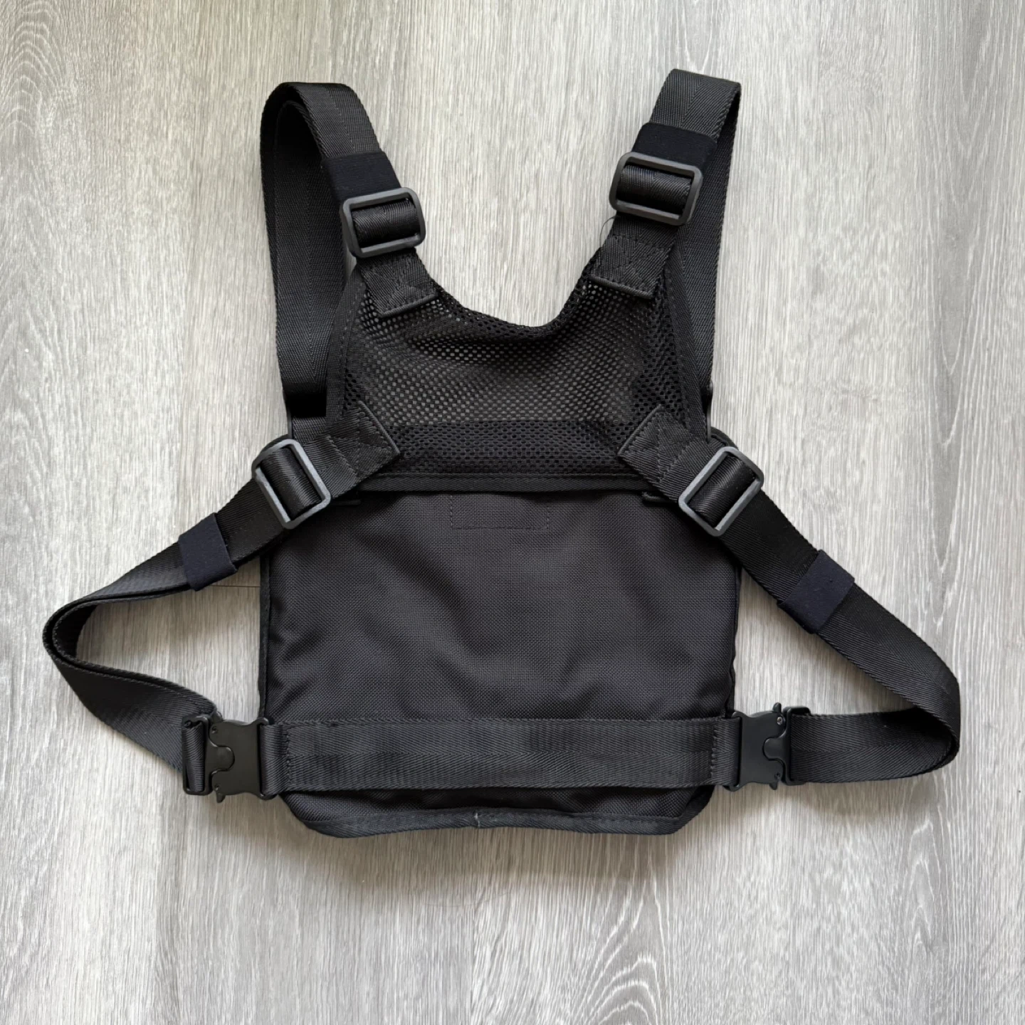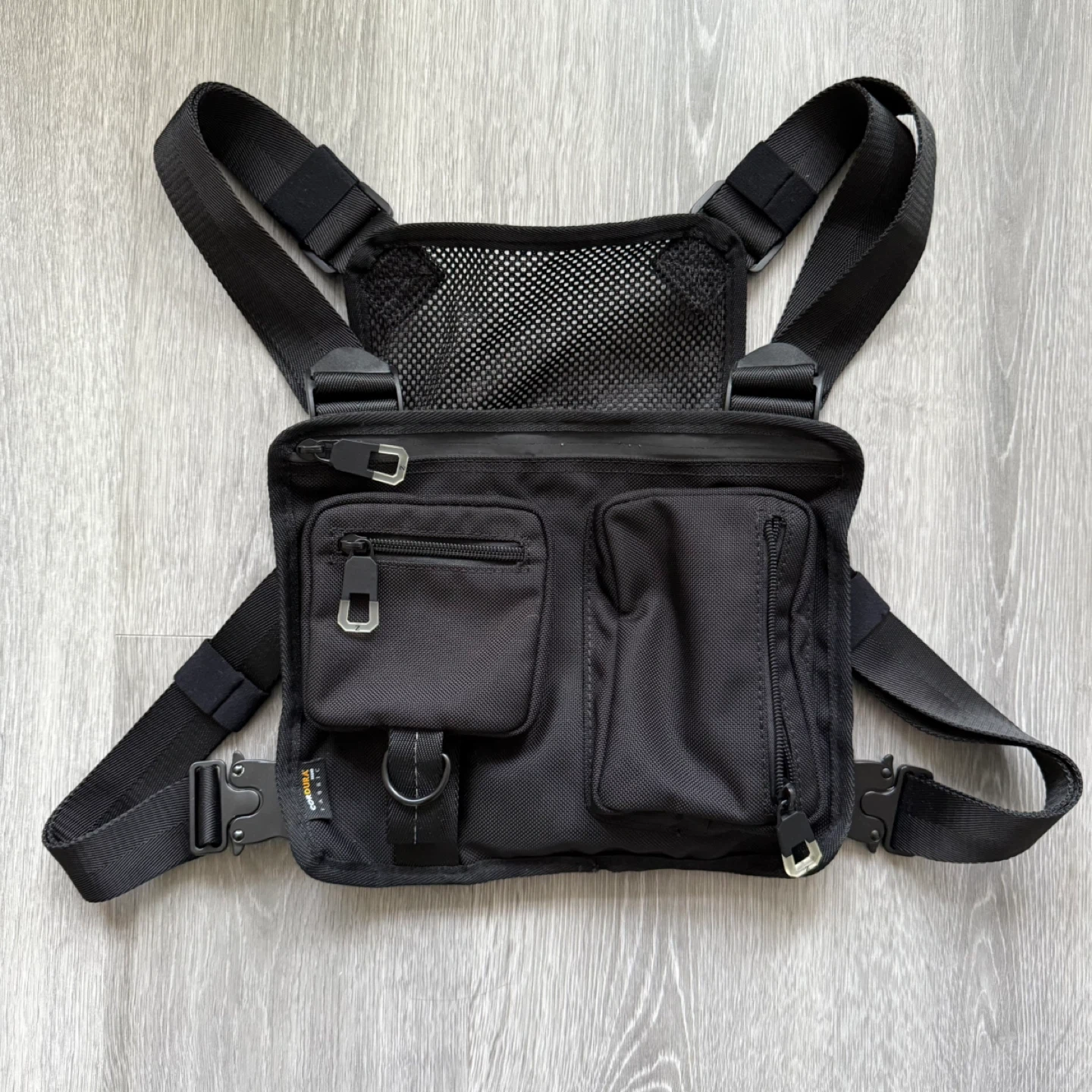 Selling a black chest rig bag. It features adjustable straps and multiple pockets for storage. Perfect for keeping essentials close and secure! Also great as an outfit accessory.
