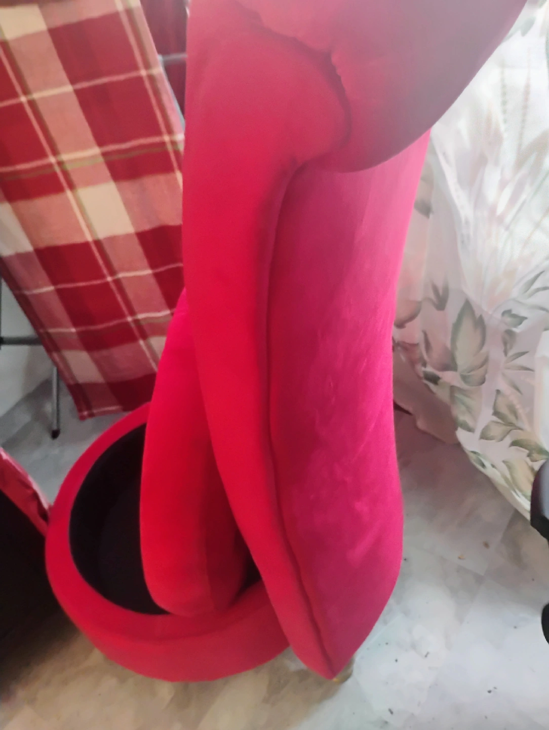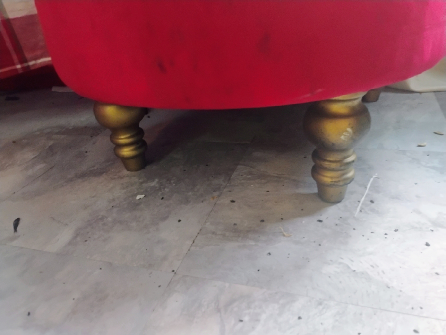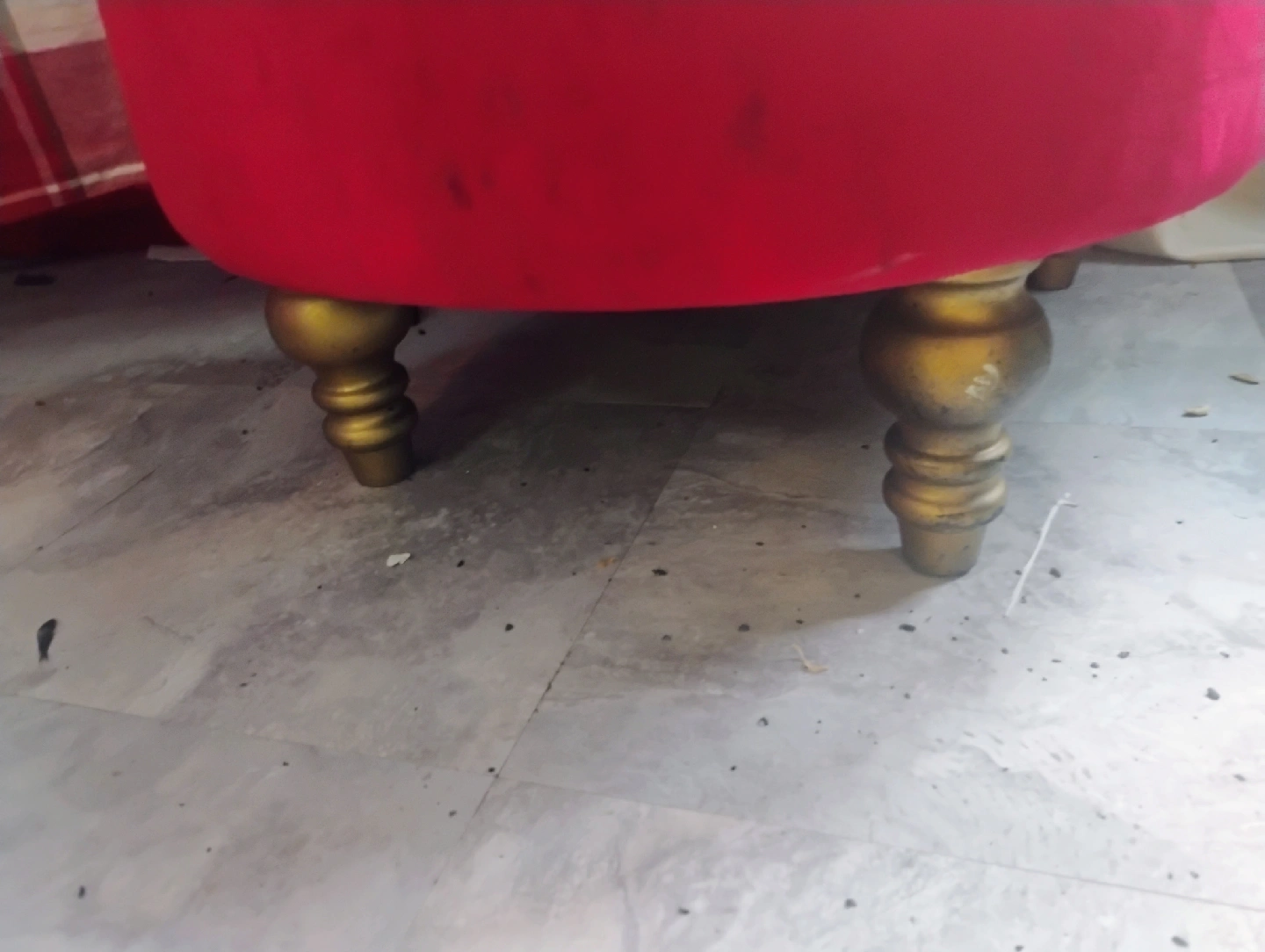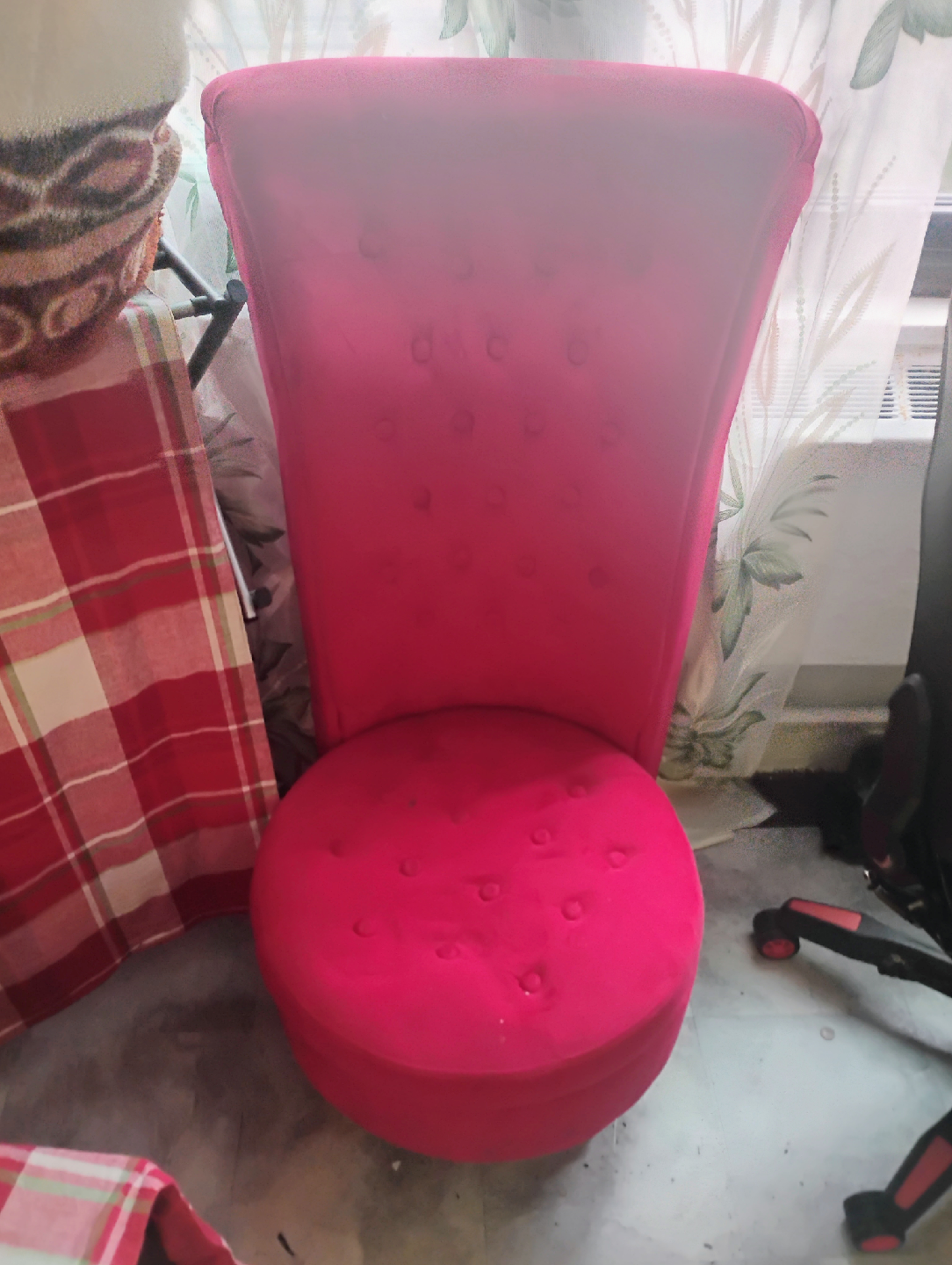 Selling a pink tufted accent chair. It has a round seat and gold-colored legs. The chair is in good condition and would be a cute addition to any room!