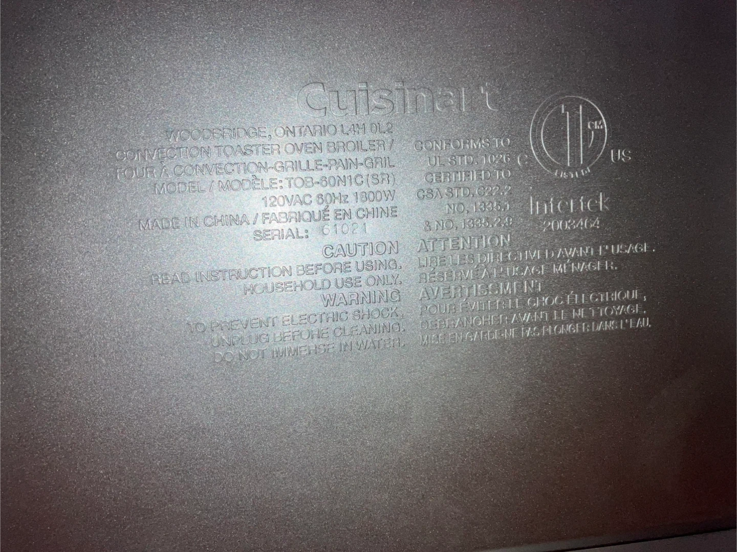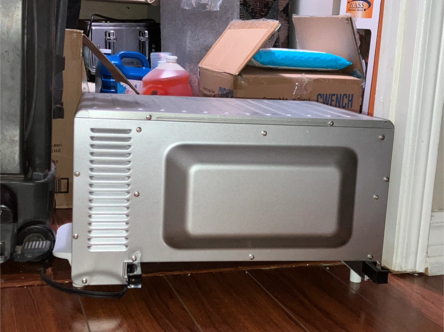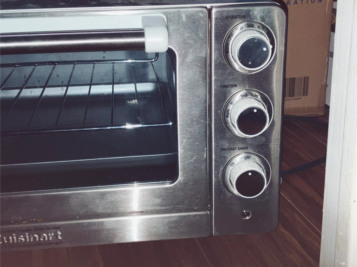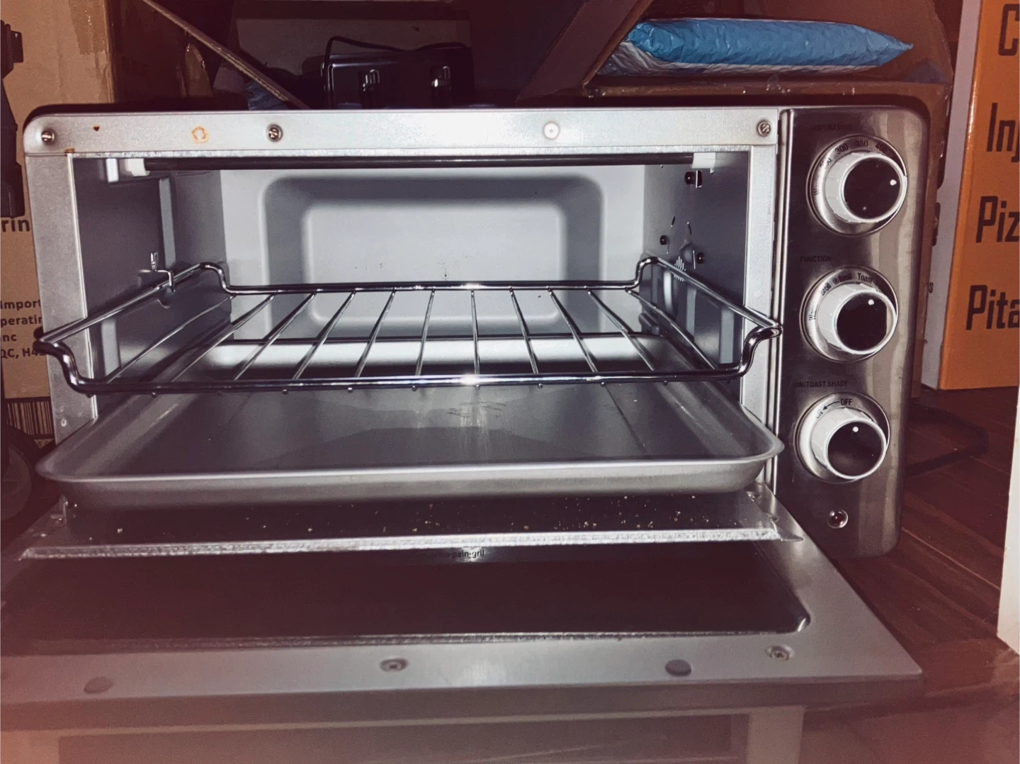 This toaster oven has barely been used and it also has a broiler and bake function. It can reach temperatures around 450 F, its dimensions are 31 cm x 42 cm x 24.5 cm and it weighs about 5.7 kg
