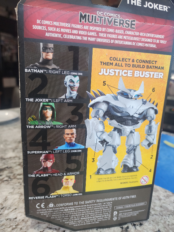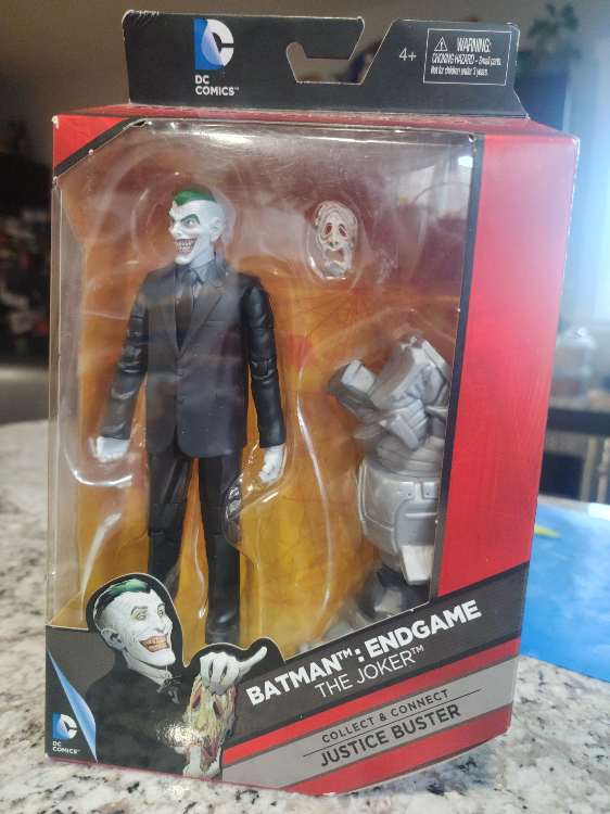 Selling a DC Comics Multiverse The Joker Endgame action figure! This figure is part of the collect and connect Justice Buster series. It includes the left arm piece for the Justice Buster. Great for any DC Comics fan!