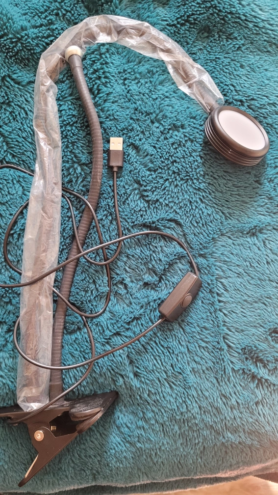 I'm selling a clip-on desk lamp. It's USB powered and has a flexible gooseneck so you can position the light just where you need it. Perfect for a desk, bedside table, or anywhere you need a little extra light