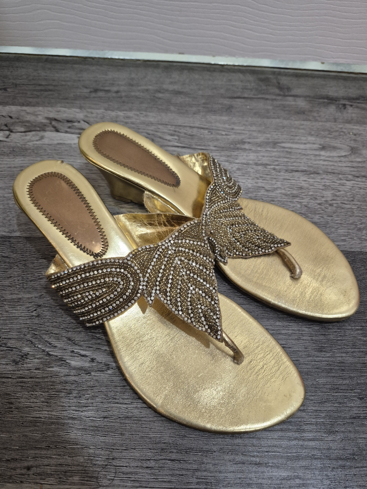 These gold thong sandals are in great condition and ready for a new home! They feature beautiful beaded embellishments in a leaf-like design. Perfect for a South Asian function or a bohemian look
