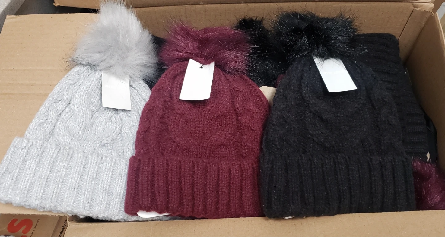 Here are some cable knit beanies with pom poms! Three hats,, one each in gray, burgundy, and black. Perfect for keeping your head warm this winter. Cash only pickup in Queens or Hicksville NY