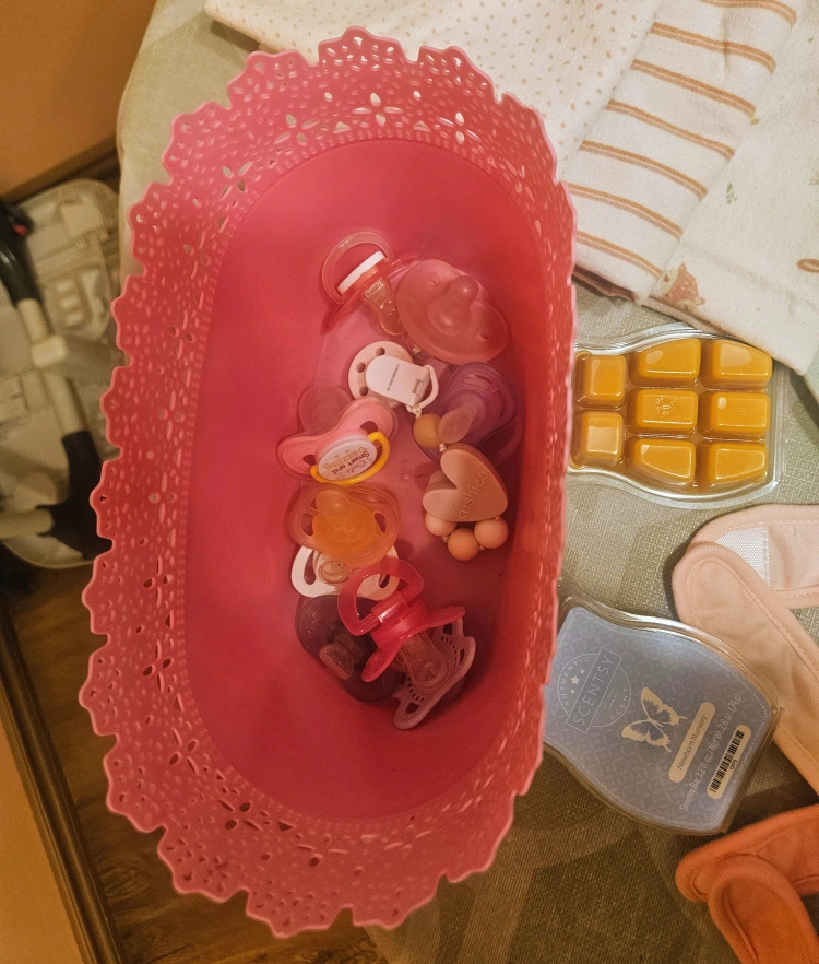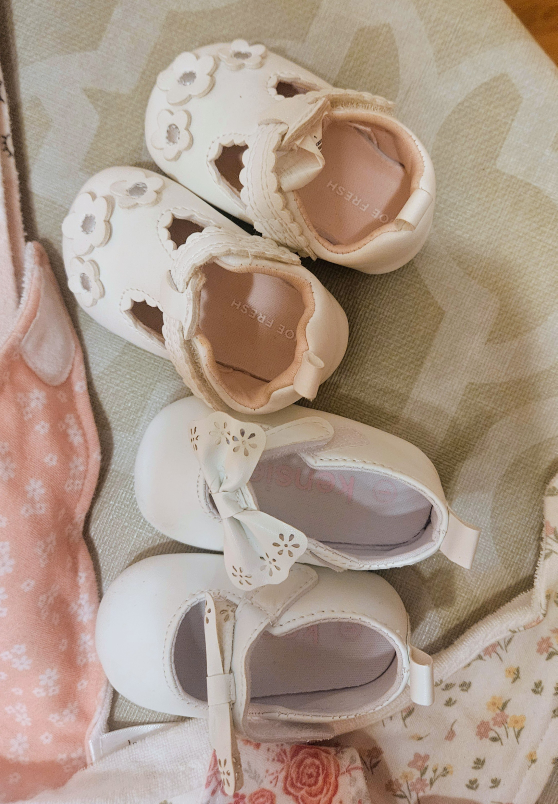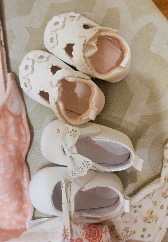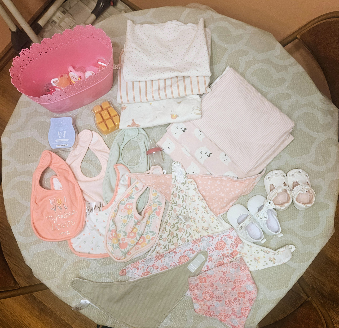 Selling a bundle of baby girl items including receiving blankets, shoes, bibs, and pacifiers. All in great condition and ready for a new home!