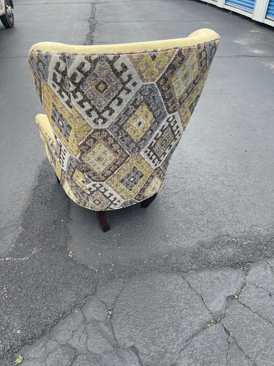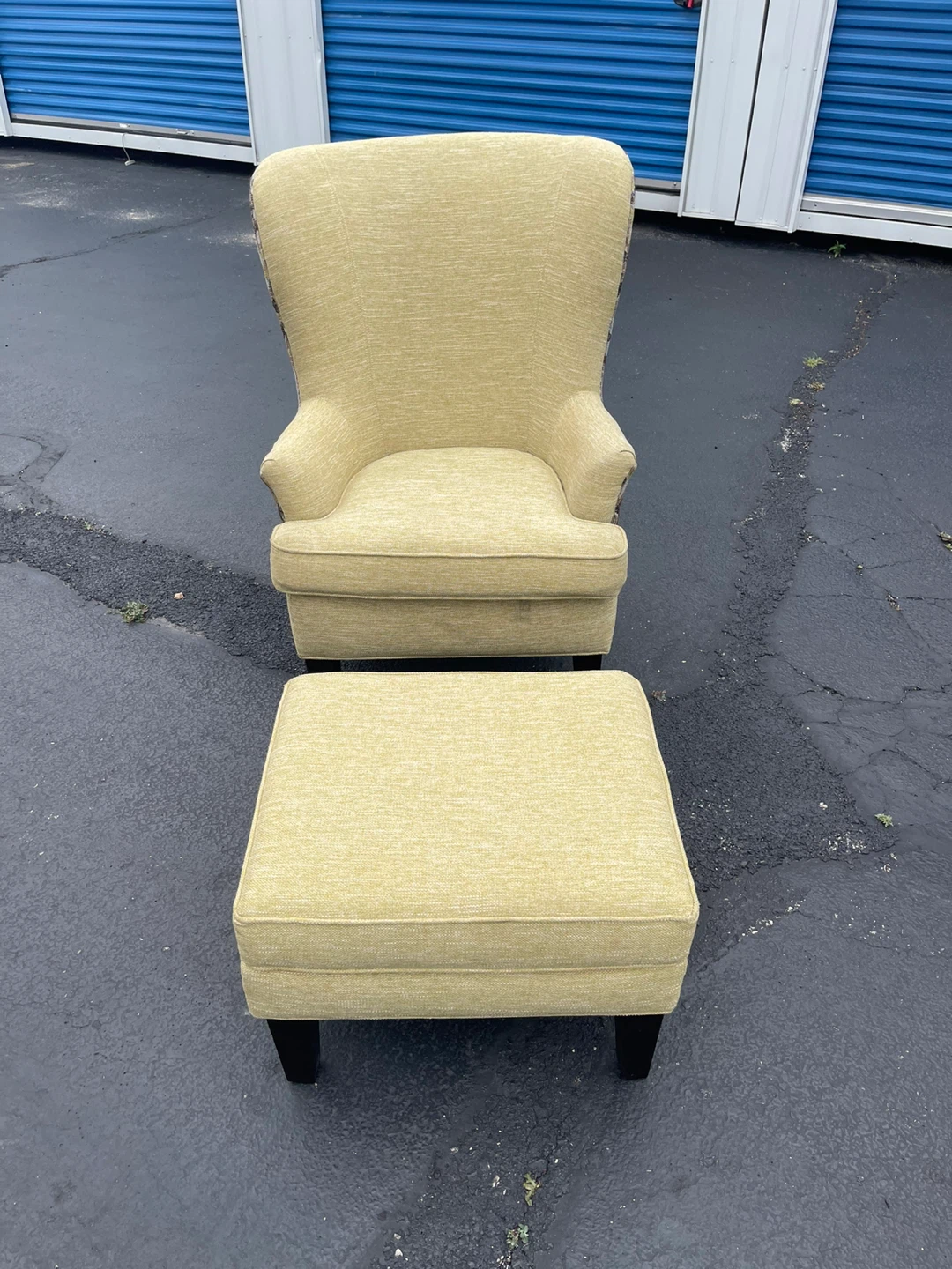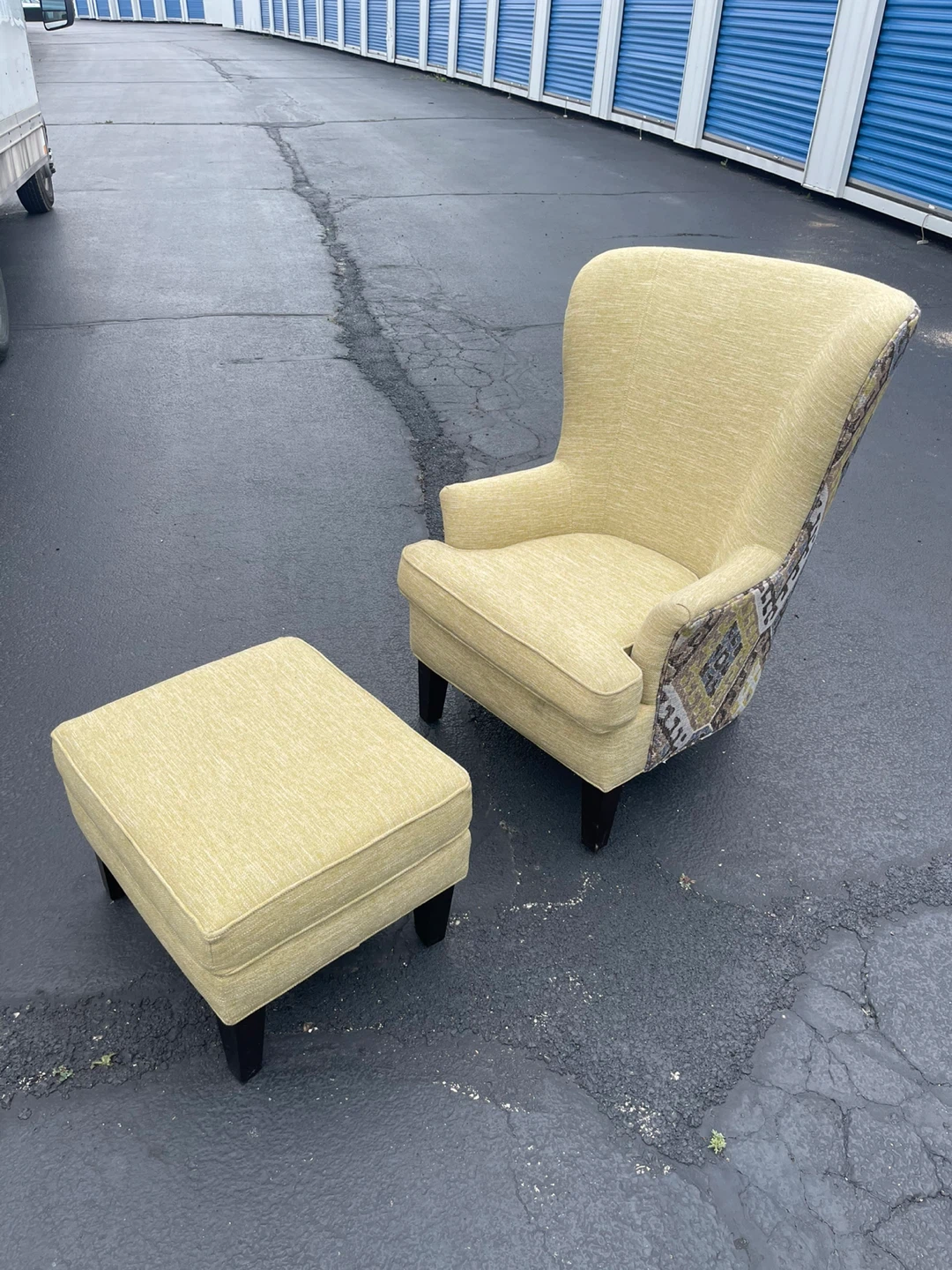Selling a comfortable armchair with a matching ottoman. The chair features a high back and armrests, perfect for relaxing. The ottoman provides a comfortable place to rest your feet. The set is upholstered in a light yellow fabric with a patterned back. It's a great addition to any living room or reading nook!