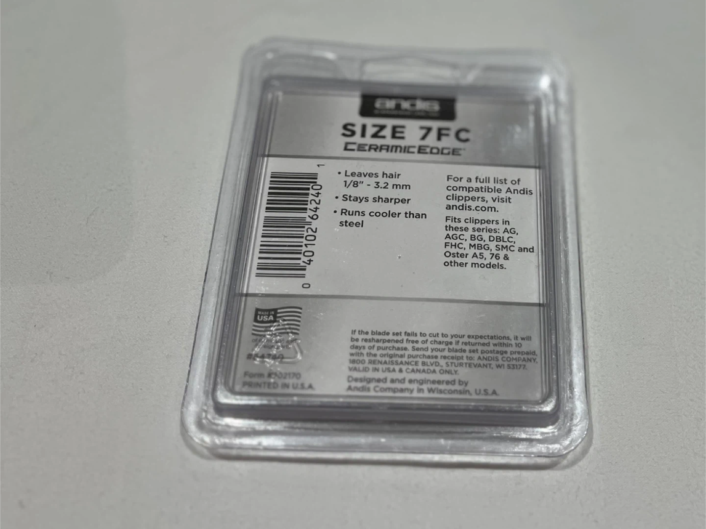 Andis CeramicEdge size 7FC clipper blade. This blade leaves hair at 1/8" - 3.2 mm. It stays sharper and runs cooler than steel, making it a great addition to your grooming tools. Fits clippers in these series: AG, AGC, BG, DBLC, FHC, MBG, SMC and Oster A5, 76 & other models.
