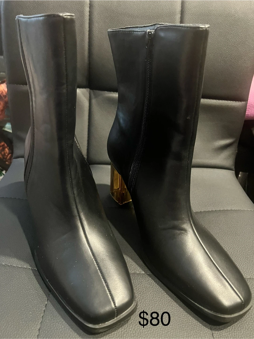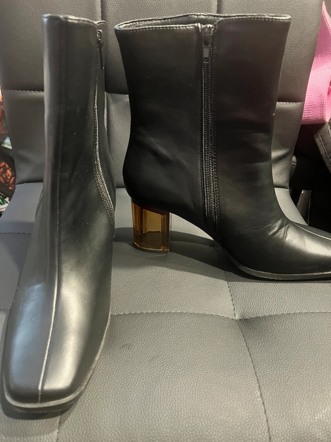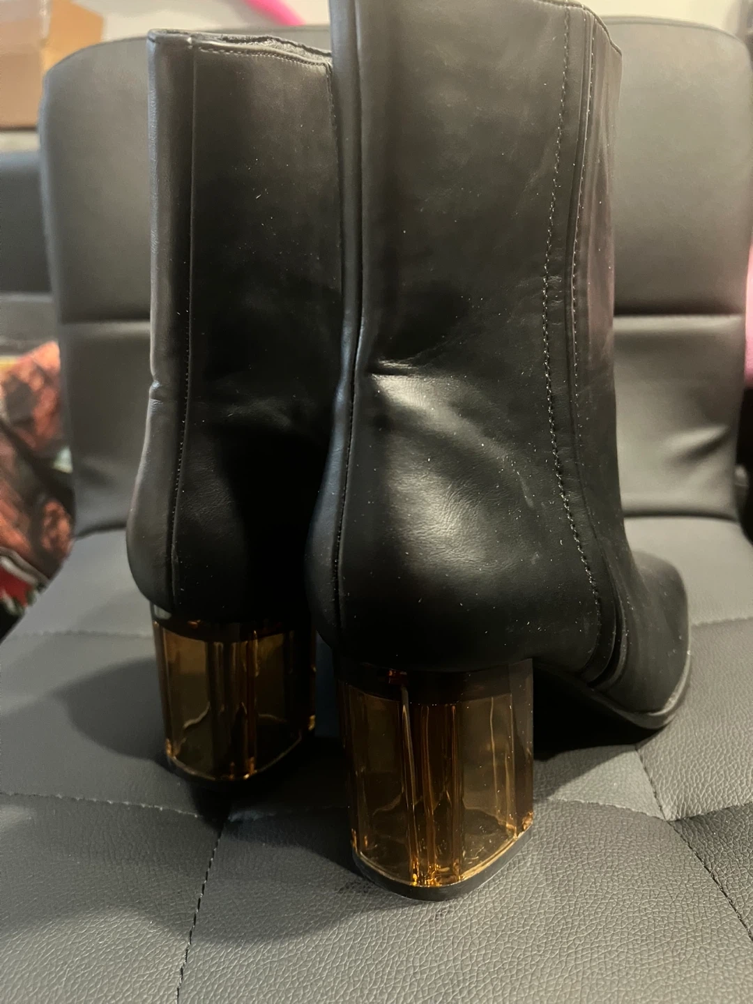 Selling a pair of new stylish black ankle boots! They feature a unique clear heel that adds a modern touch. They are the perfect boots for this chilly fall weather. These boots are a great addition to any wardrobe, casual or dressy. Original price $123