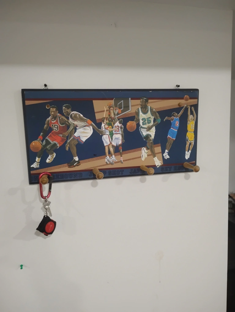 Here's a unique wall-mounted key holder featuring basketball players in action! It's perfect for adding a sporty touch to your entryway or any room. It's in great condition and ready to hold your keys, lanyards, or small accessories
