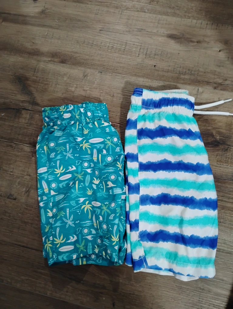 Selling two pairs of swim trunks! One pair is turquoise with a beachy pattern, and the other is blue and white striped. Both are in great condition and ready for some fun in the sun
