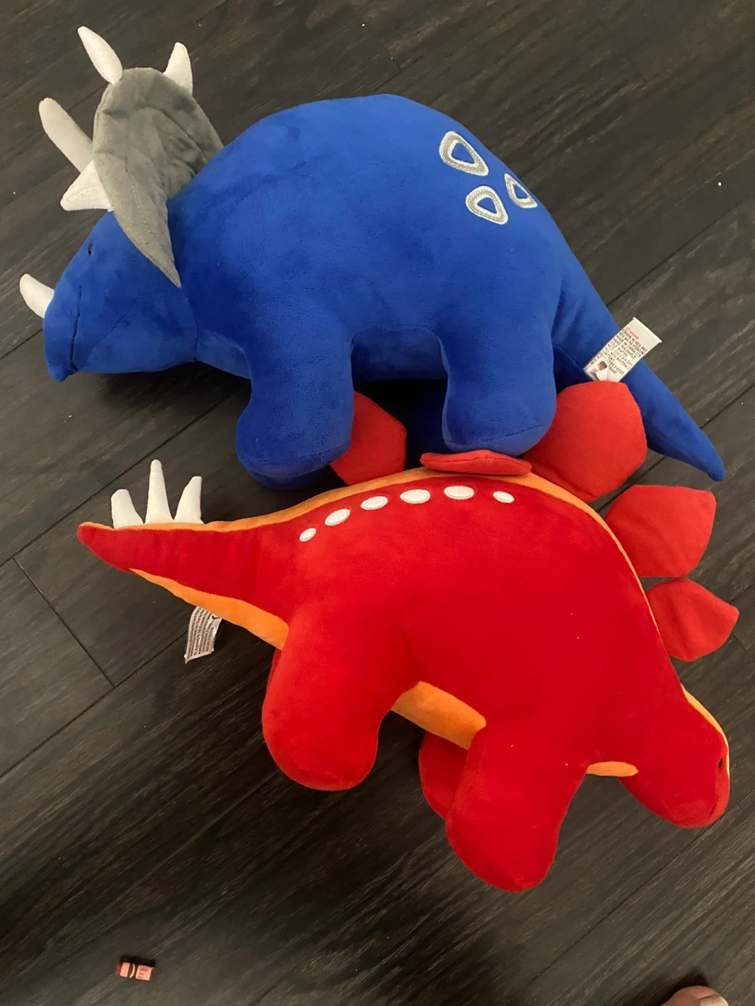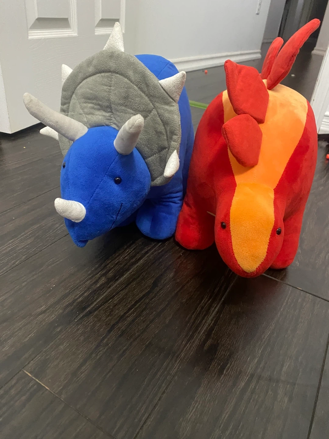 Selling a pair of adorable dinosaur plushies! You'll get one blue triceratops and one red stegosaurus. They're both in great shape and ready for a new home!