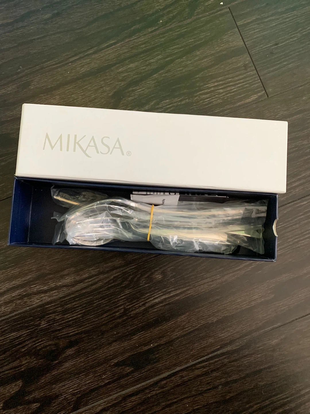 Selling a brand new Mikasa KYA 5-piece place setting! It comes in its original box. This set includes a dinner fork, salad fork, dinner knife, soup spoon, and teaspoon. Originally bought for $69.99!