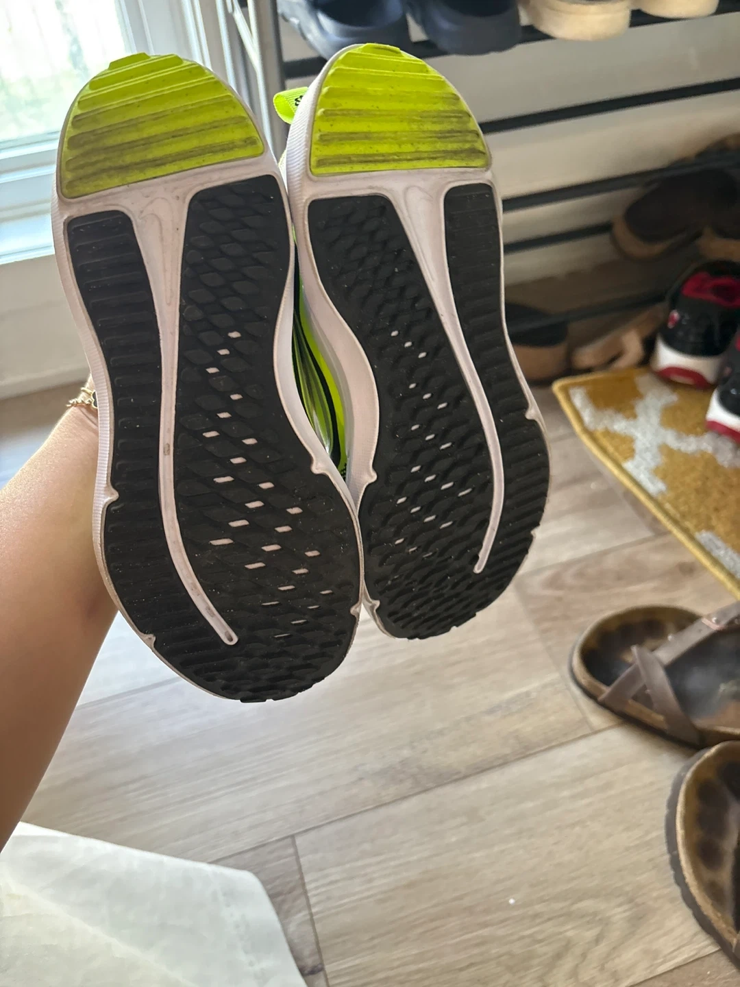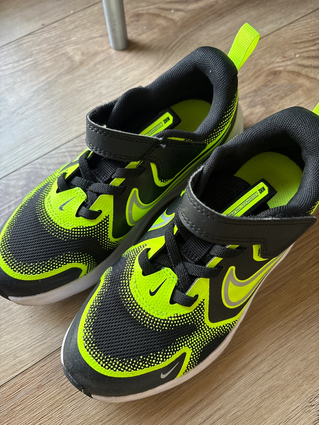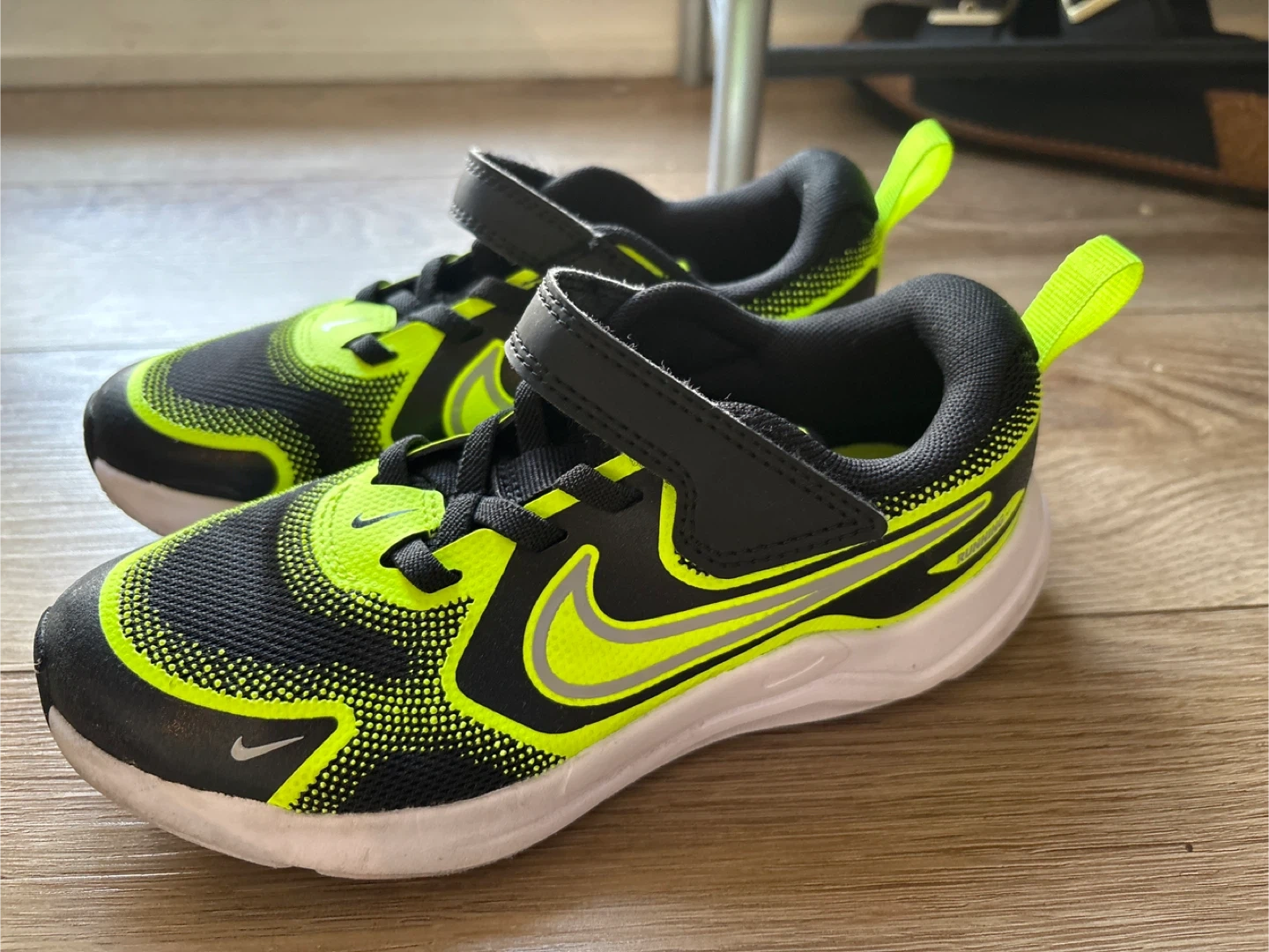 Selling a pair of Nike Downshifter 12 kids' running shoes. They're in good condition and perfect for active kids. The shoes are black with neon green accents and feature a velcro strap and laces for a secure fit. Size is 13 US.