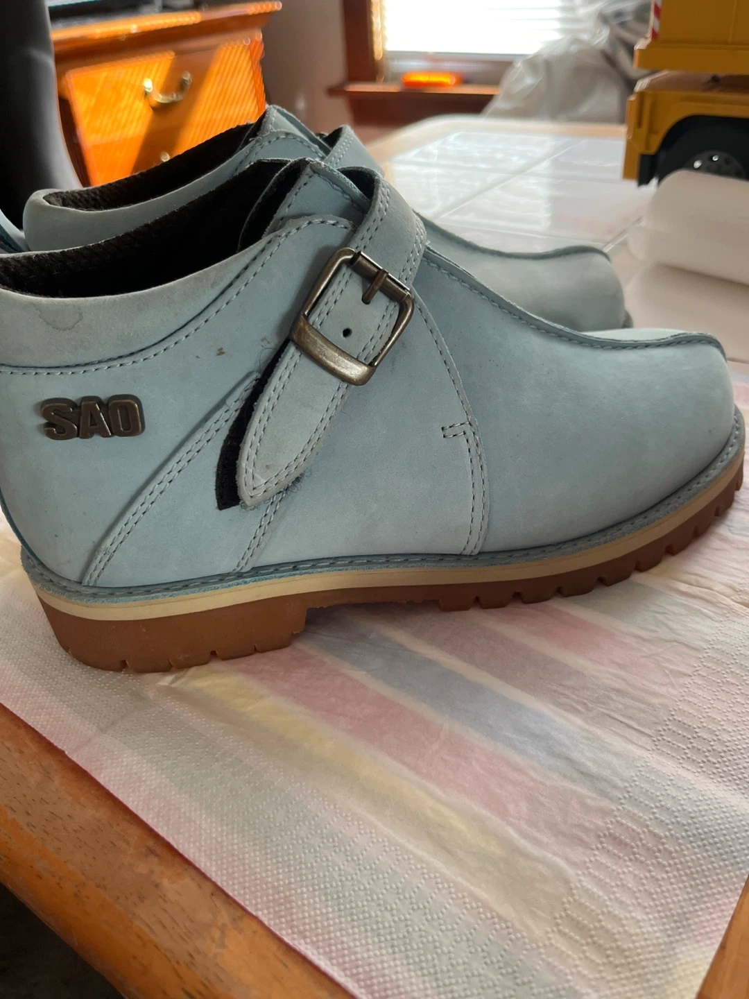 Selling a pair of light blue shoes with a buckle. They are in good condition and ready for a new home!