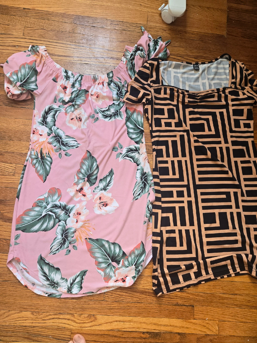 280Two cute dresses! One is a pink floral print, off-the-shoulder style, and the other is a geometric print dress. Both are in great condition and ready for a new home. Please only message when you ready to come (tired of flakes). pick up near Church/Ocean ave. 2nd floor
