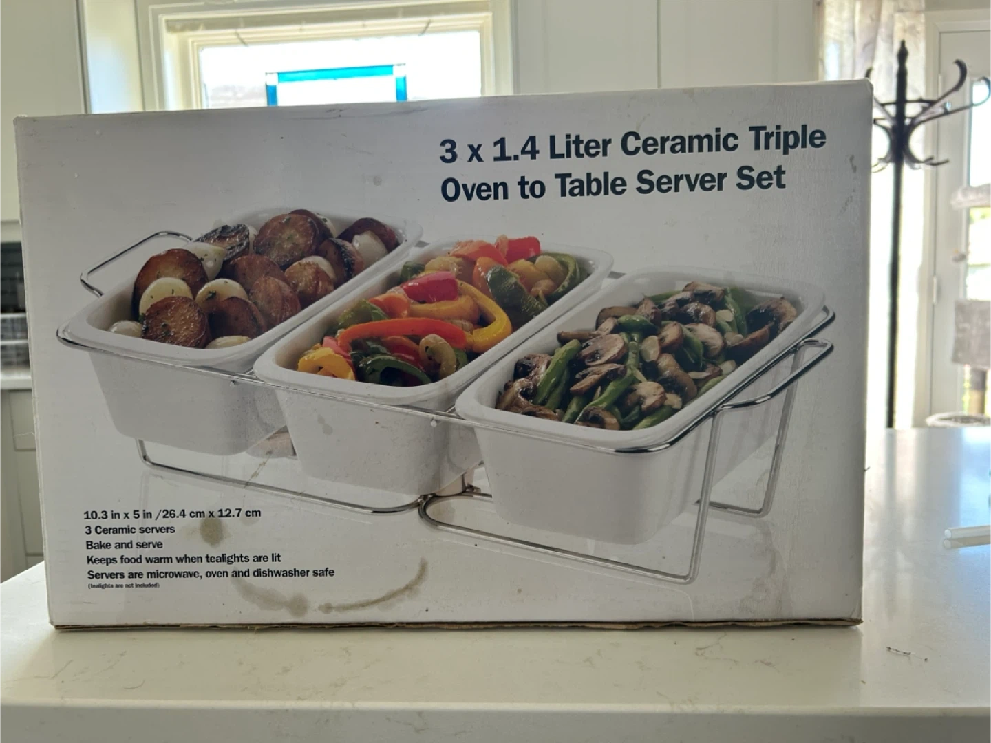 Selling a 3 x 1.4 Liter Ceramic Triple Oven to Table Server Set! It's perfect for baking and serving. The dimensions are 10.3 in x 5 in / 26.4 cm x 12.7 cm. It includes 3 ceramic servers. It can keep food warm when teallights are lit. The servers are microwave, oven and dishwasher safe (teallights are not included)