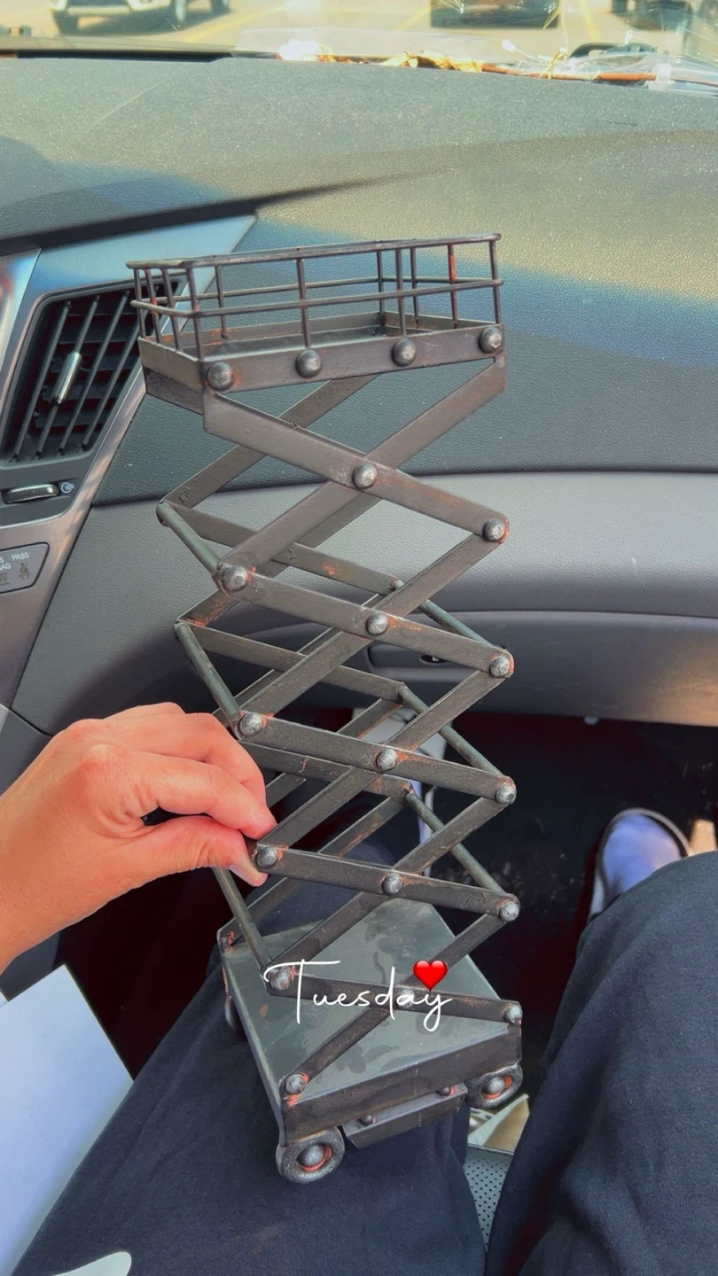 Selling a unique metal scissor lift table decoration. It's in good condition and would make a great addition to any home or office. It has a rustic, industrial look