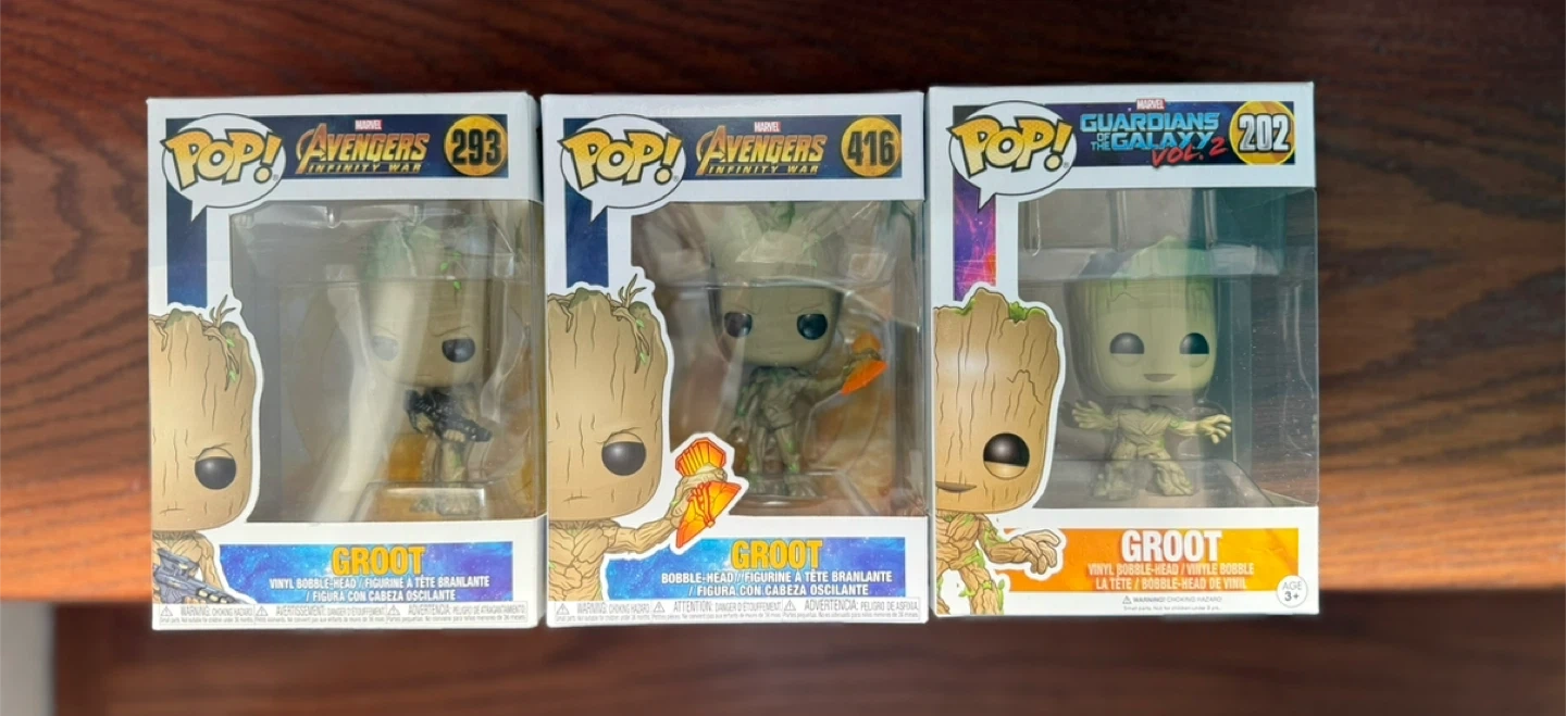Selling Funko Pop! figures of Groot! $10 each - Avengers Infinity War #293 - Avengers Infinity War #416 - Guardians of the Galaxy Vol. 2 #202 All are in their original boxes and in perfect condition!