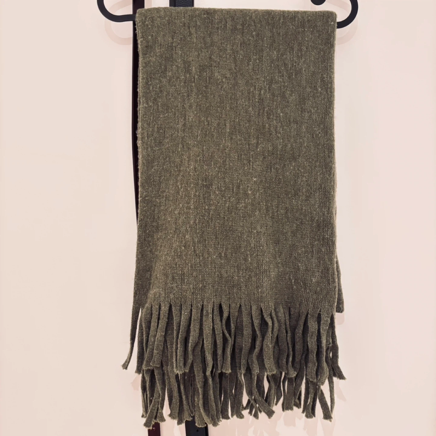 Cozy olive green scarf, perfect for adding a touch of warmth and style to your outfit! The material feels soft and comfortable against the skin, making it ideal for chilly days. In good condition!